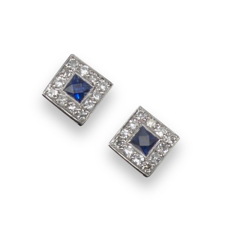 A pair of sapphire and diamond cluster earrings, the square-shaped sapphires are set within a surround of single-cut diamonds within square-shaped white gold mounts, post fittings, each 0.7cm wide