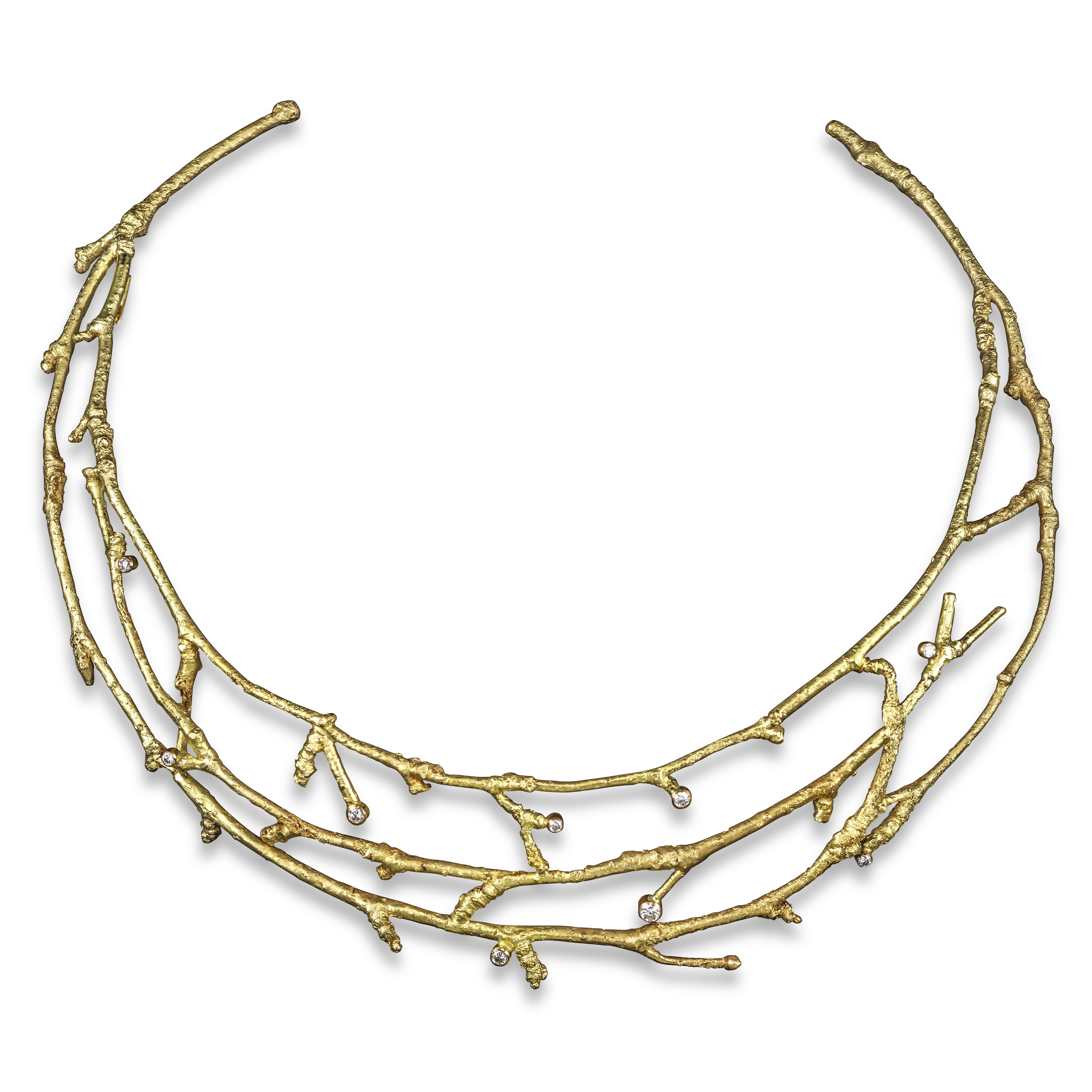 A yellow gold branch-form torque necklet, set with graduated round brilliant-cut diamonds, marked SHAW, 13cm internal diameter, 58g