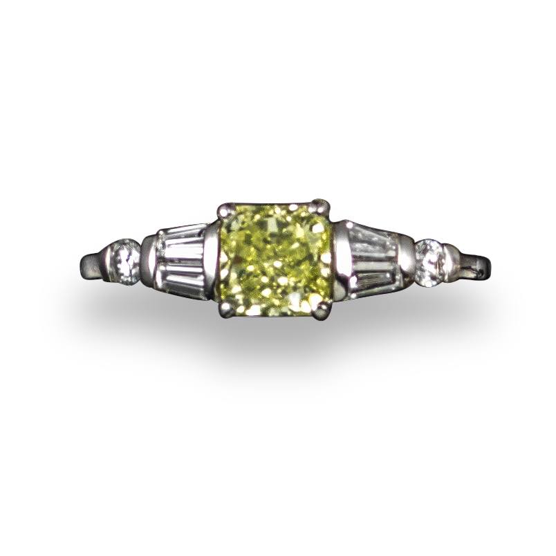 A fancy yellow diamond ring, the cushion-shaped diamond weighs 1.01cts, within tapered baguette and circular-cut shoulder diamonds in white gold, size M 1/2