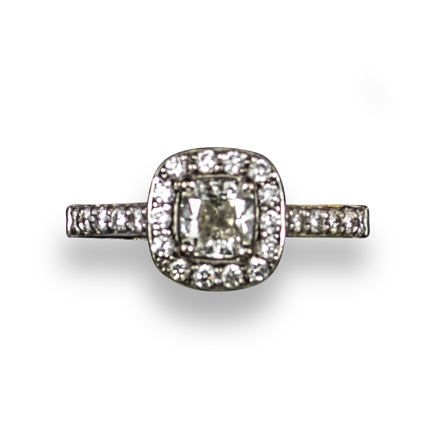 A diamond cluster ring, the central cushion-shaped diamond weighs 0.70cts and is set within a surround of circular-cut diamonds and diamond-set shoulders in white gold, with laser inscription to the girdle corresponding to the GIA certificate, size M 1/2, case