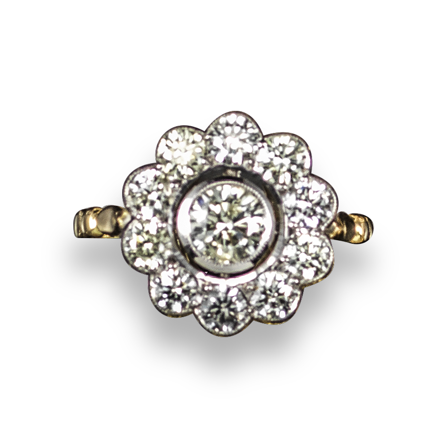A diamond cluster ring, the centre round brilliant-cut diamond weighs approximately 0.50cts and is set within a surround of ten round brilliant-cut diamonds in yellow and white gold, size P 1/2