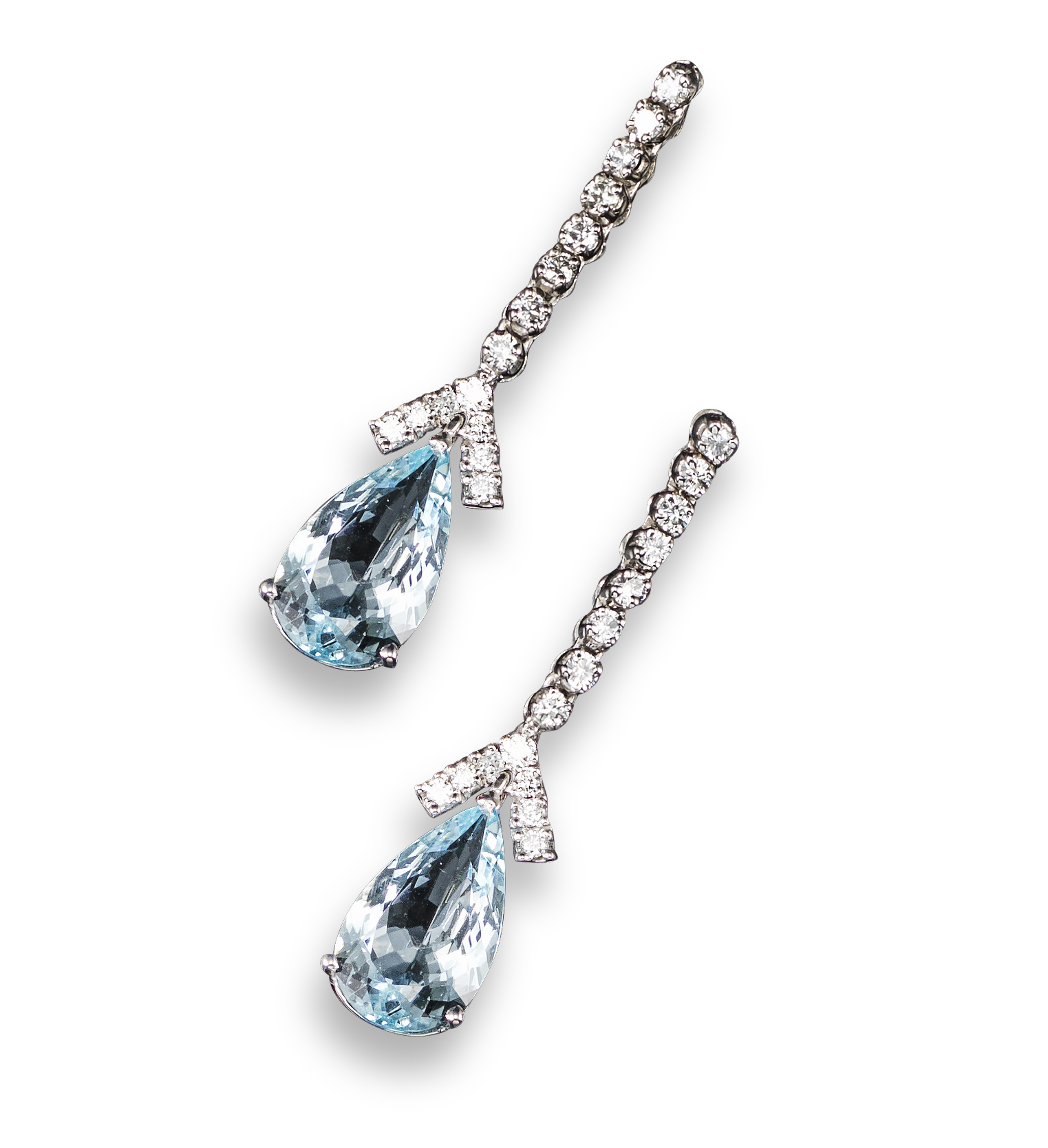 A pair of aquamarine and diamond drop earrings, each pear-shaped aquamarine is set below a diamond-set chevron and suspends from an articulated line of round brilliant-cut diamonds in 18ct white gold, London hallmarks for 2015, post fittings, 3.8cm high