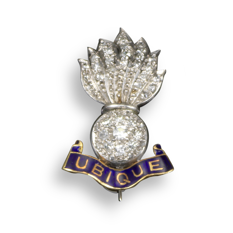 A Regimental brooch for the The Royal Engineers, set with diamonds above a blue enamel swag in platinum and gold, 2.6cm high