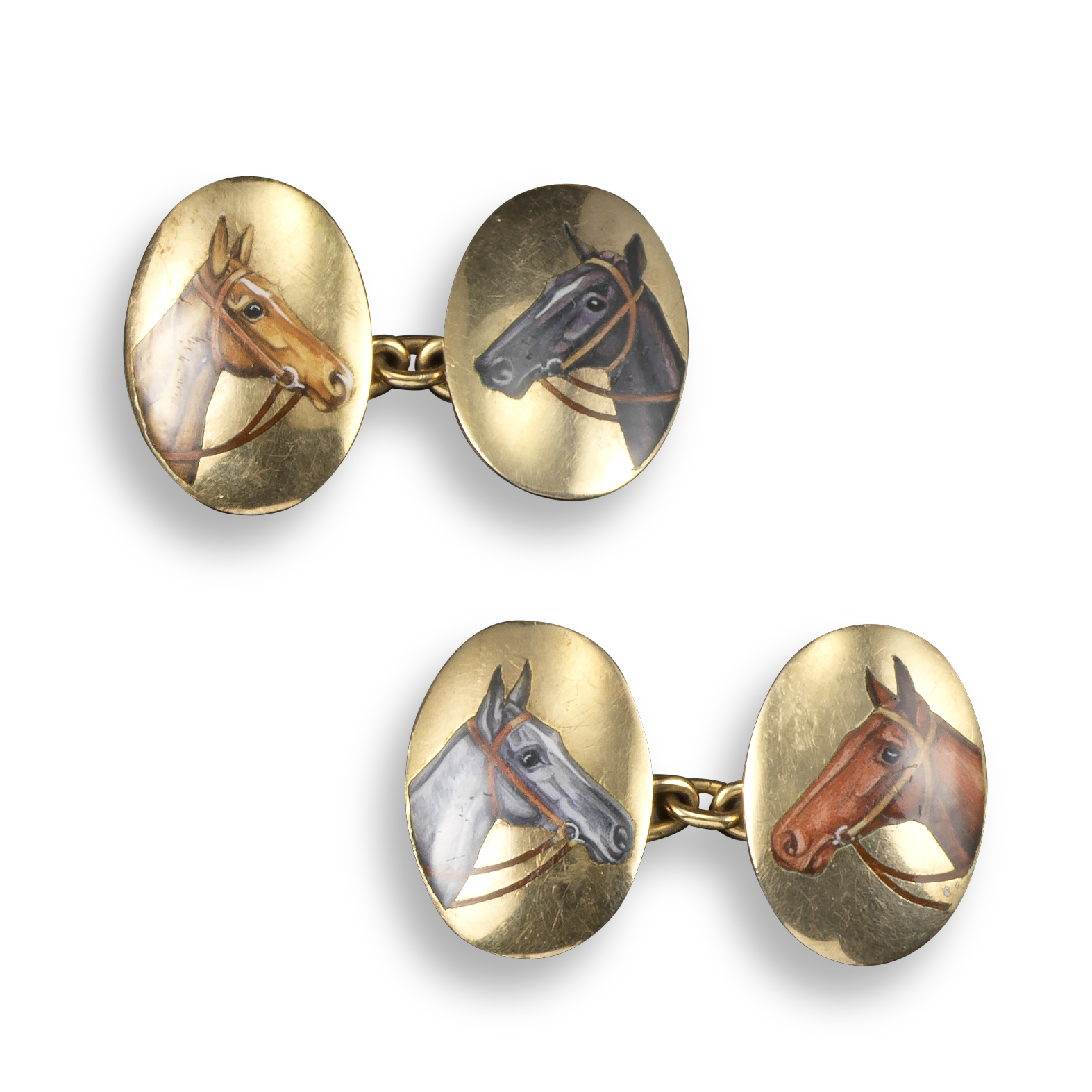 A pair of gold horse cufflinks, each oval link painted with an enamel horse head, including a chestnut, bay, gray and dark bay, stamped 9ct and maker's mark A&W for Alabaster & Wilson, links 1.5cm high, fitted case by Collingwood