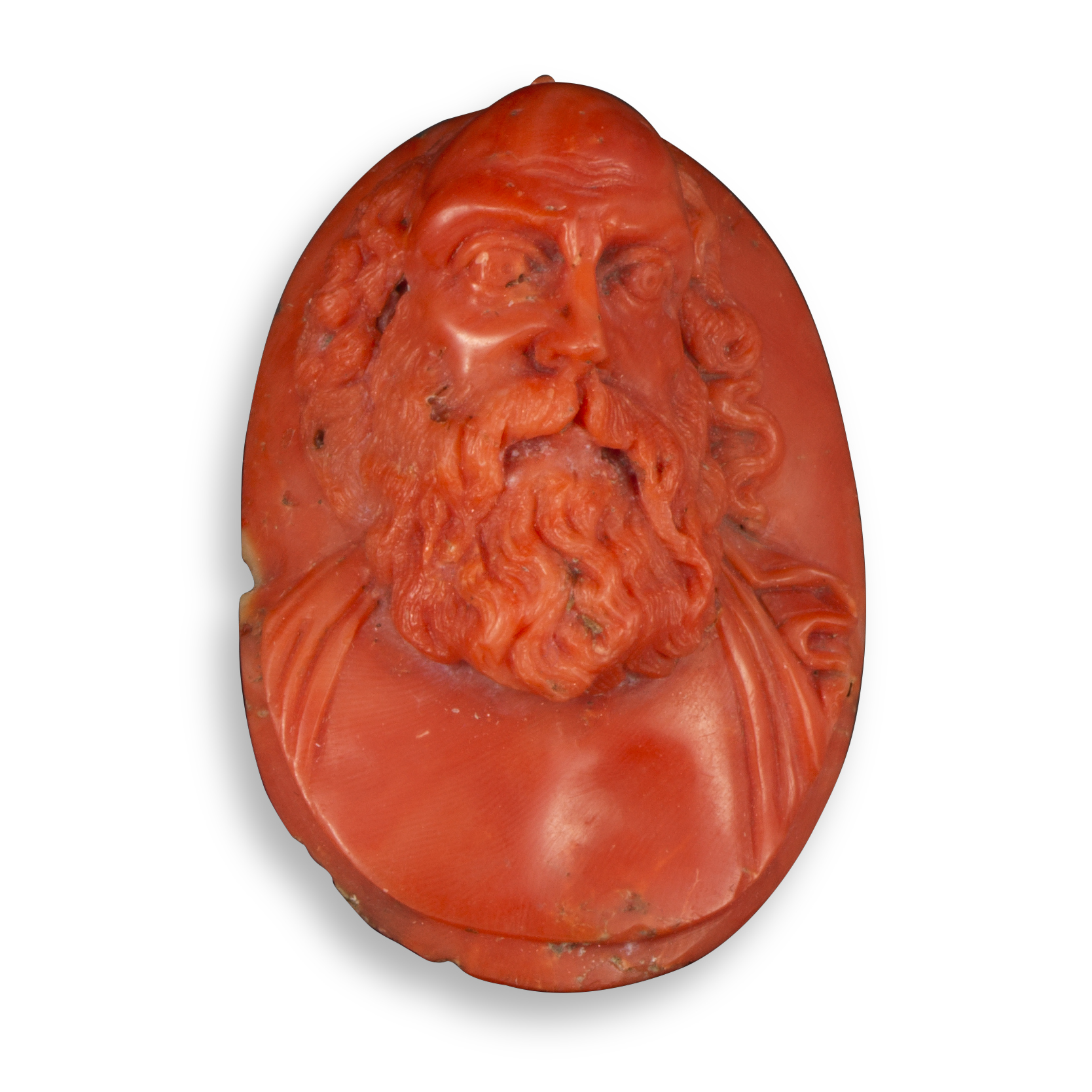 A 17th/18th century carved coral cameo, depicting the full face of a bearded man, probably a philosopher, 5cm high