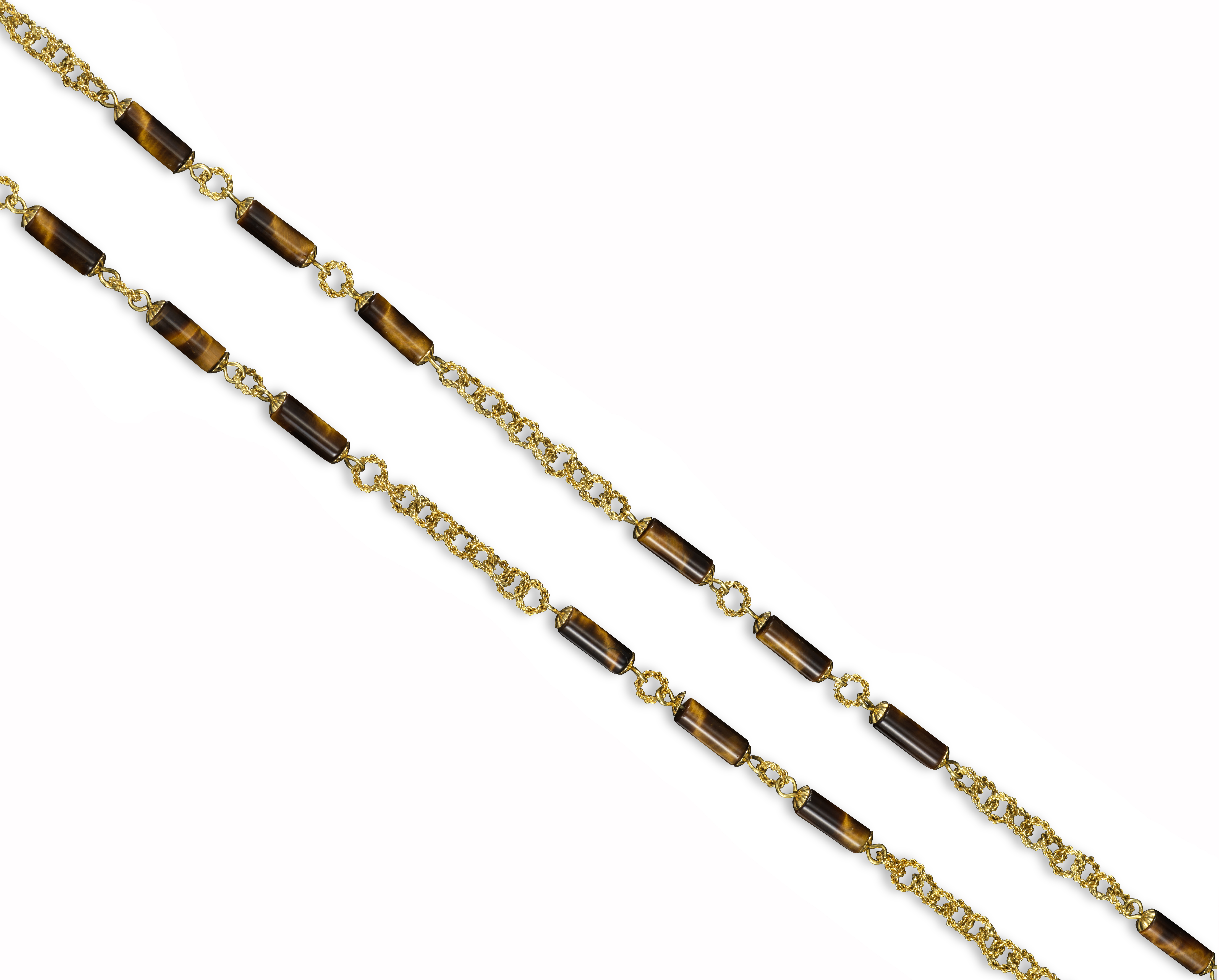 A tiger's eye long guard chain by Tiffany & Co, the circular gold links divided by tiger's eye cylindrical sections, 84cm long