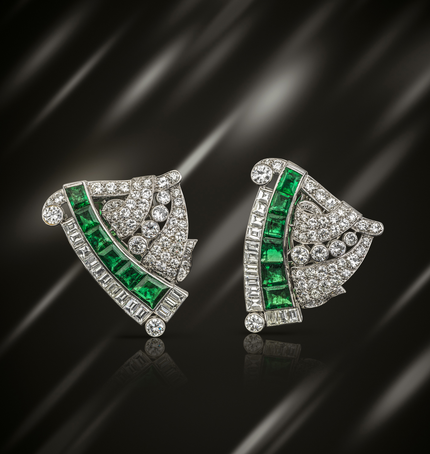 A pair of Art Deco emerald and diamond-set clip brooches, each clip set with a line of graduated tapered baguette-shaped emeralds with a border of square-shaped diamonds to one side and a scrolling design to the other set with graduated circular-cut diamonds in platinum and white gold, detaching from a white gold frame, 7cm wide