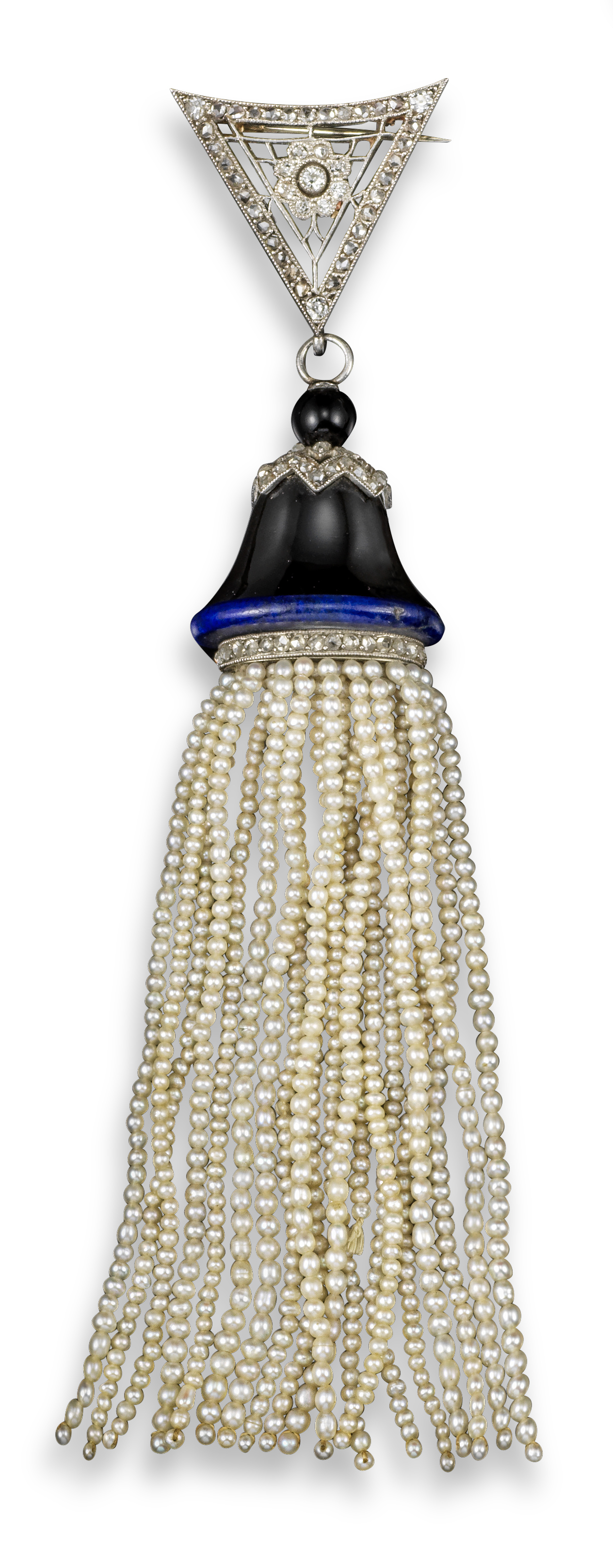 A French Belle Époque brooch pendant, the carved black onyx campagna-shaped centre section surmounted with two zig-zag sections millegrain-set with rose-cut diamonds, suspended from a diamond-set triangular upper section centred with a diamond flower head and with a tassle of seed pearls suspended from a line of rose-cut diamonds and lapis lazuli border, the platinum mount marked to the reverse with French control marks, maker's lozenge E.B. and scratched with inventory number 2056, possibly detached from a larger piece of jewellery and with later brooch fitting, 10cm high