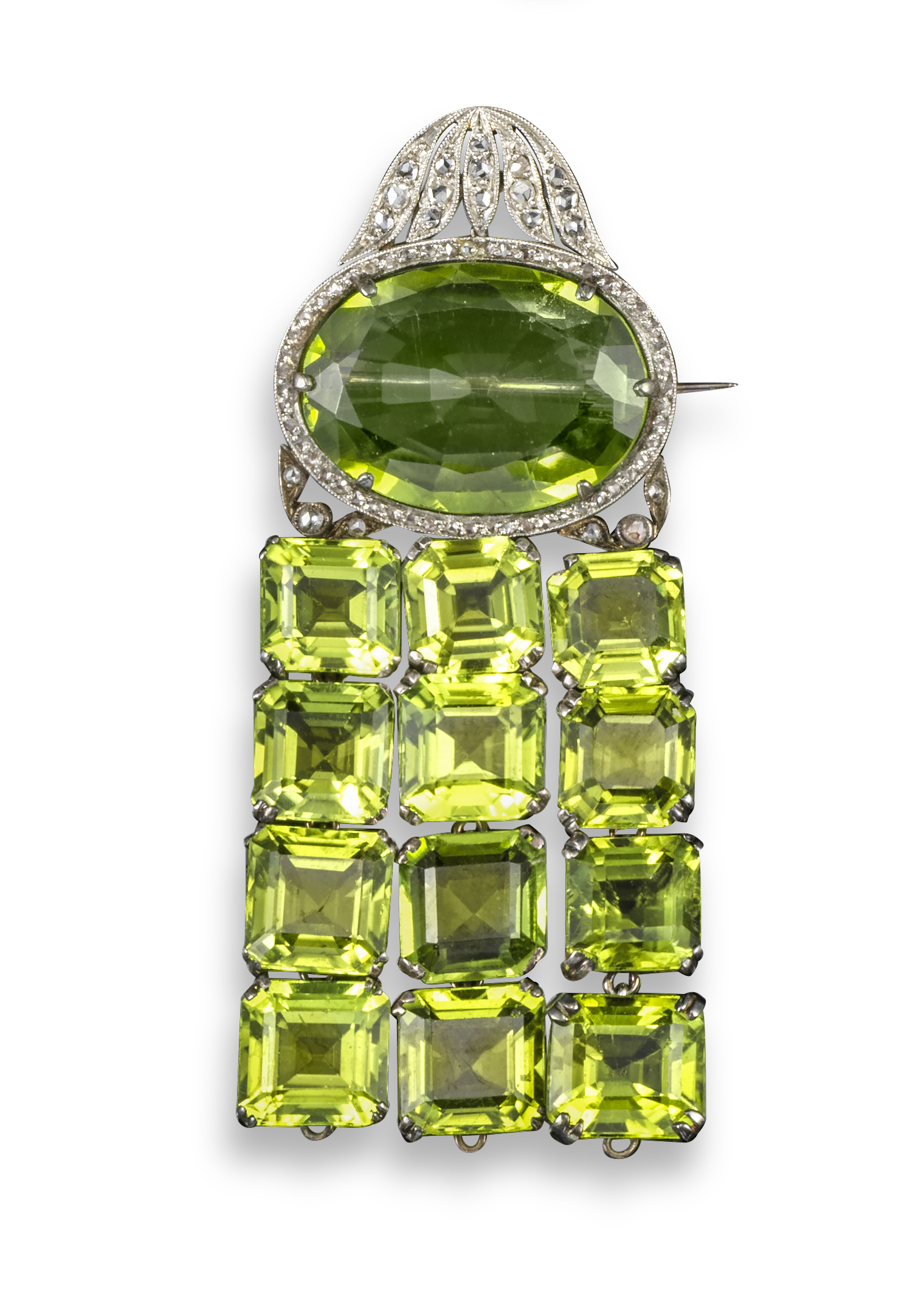 An early 20th century peridot and diamond brooch, the oval-shaped peridot set within rose-cut diamond border and suspending three articulated lines of square-shaped peridots in platinum and gold, 6cm long