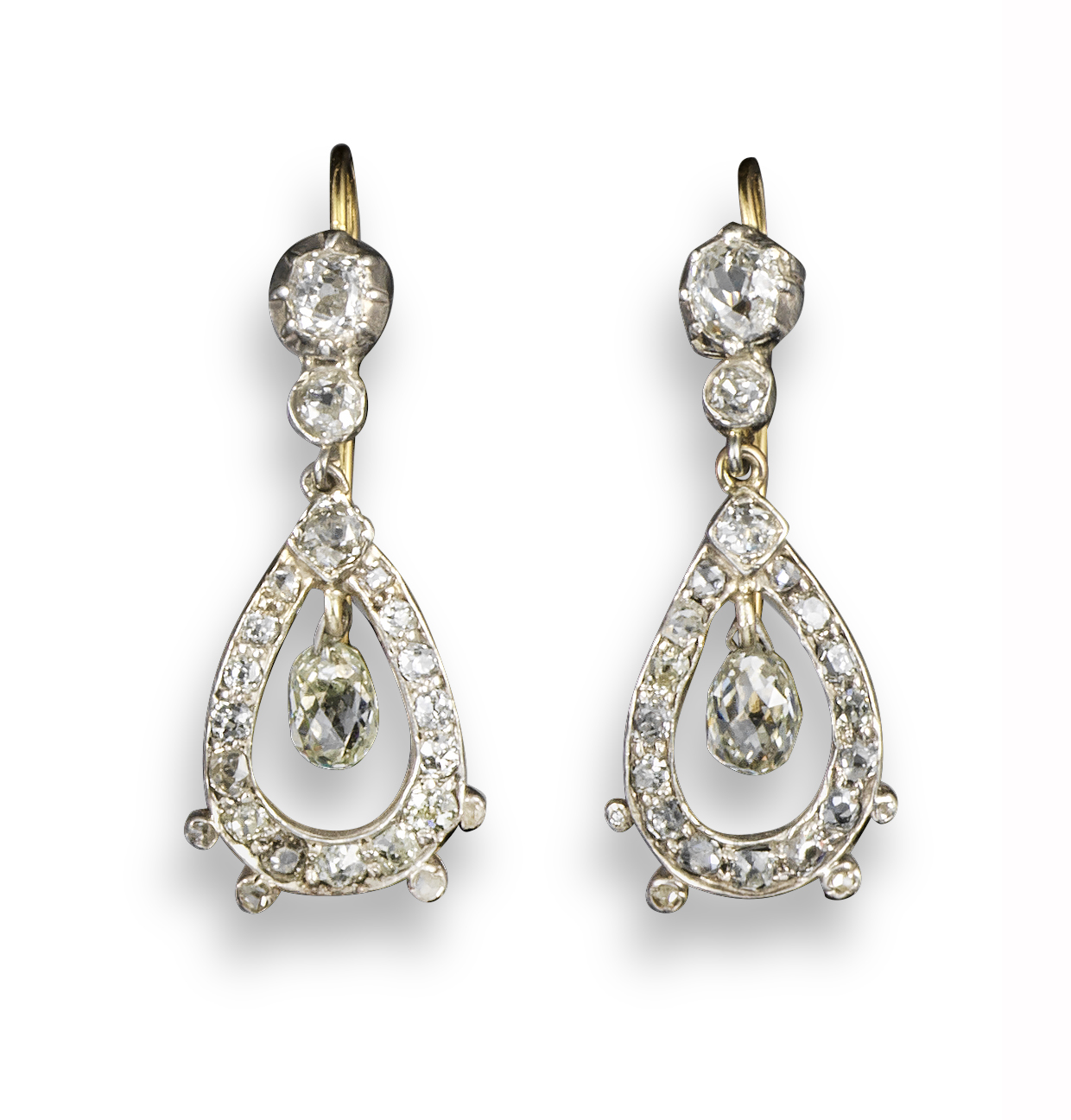 A pair of diamond-set drop earrings, each mounted with a pear-shaped pendant set with graduated rose-cut diamonds and suspending a briolette-cut diamond, two cushion-shaped diamonds above, all set in silver and gold, 3cm high