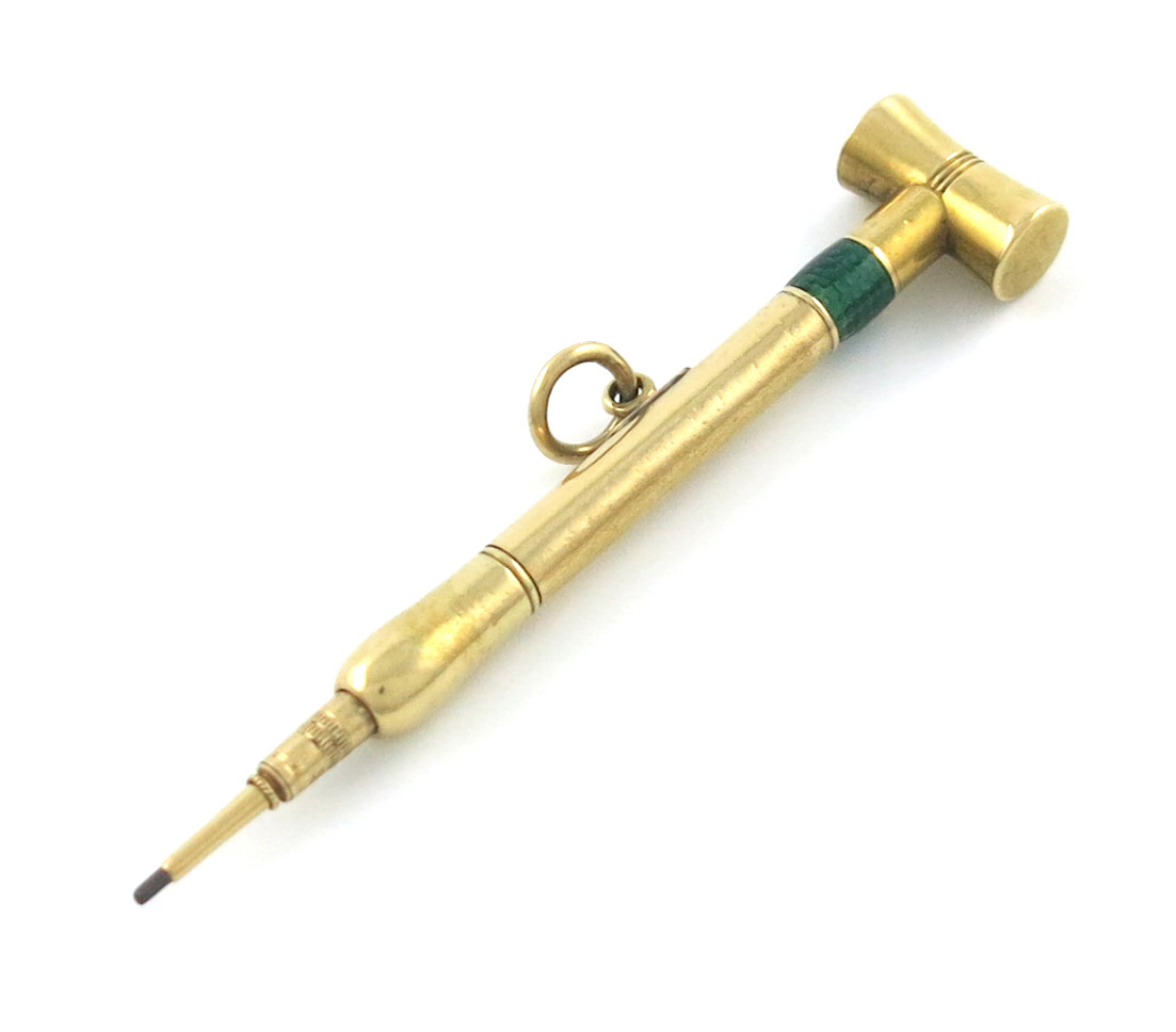 modelled as a croquet mallet, with a band of green enamel decoration, with a ring attachment, length closed 5,2cm.