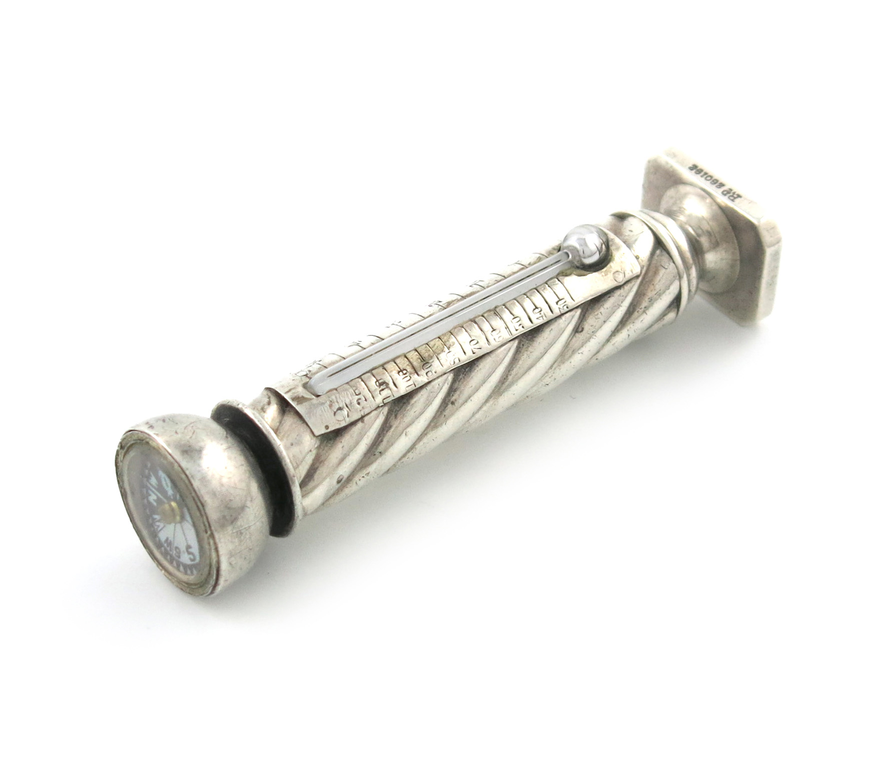 the finial modelled as a compass, (not working), the side with a thermometer, the seal matrix engraved with a monogram, length closed 7.3cm.