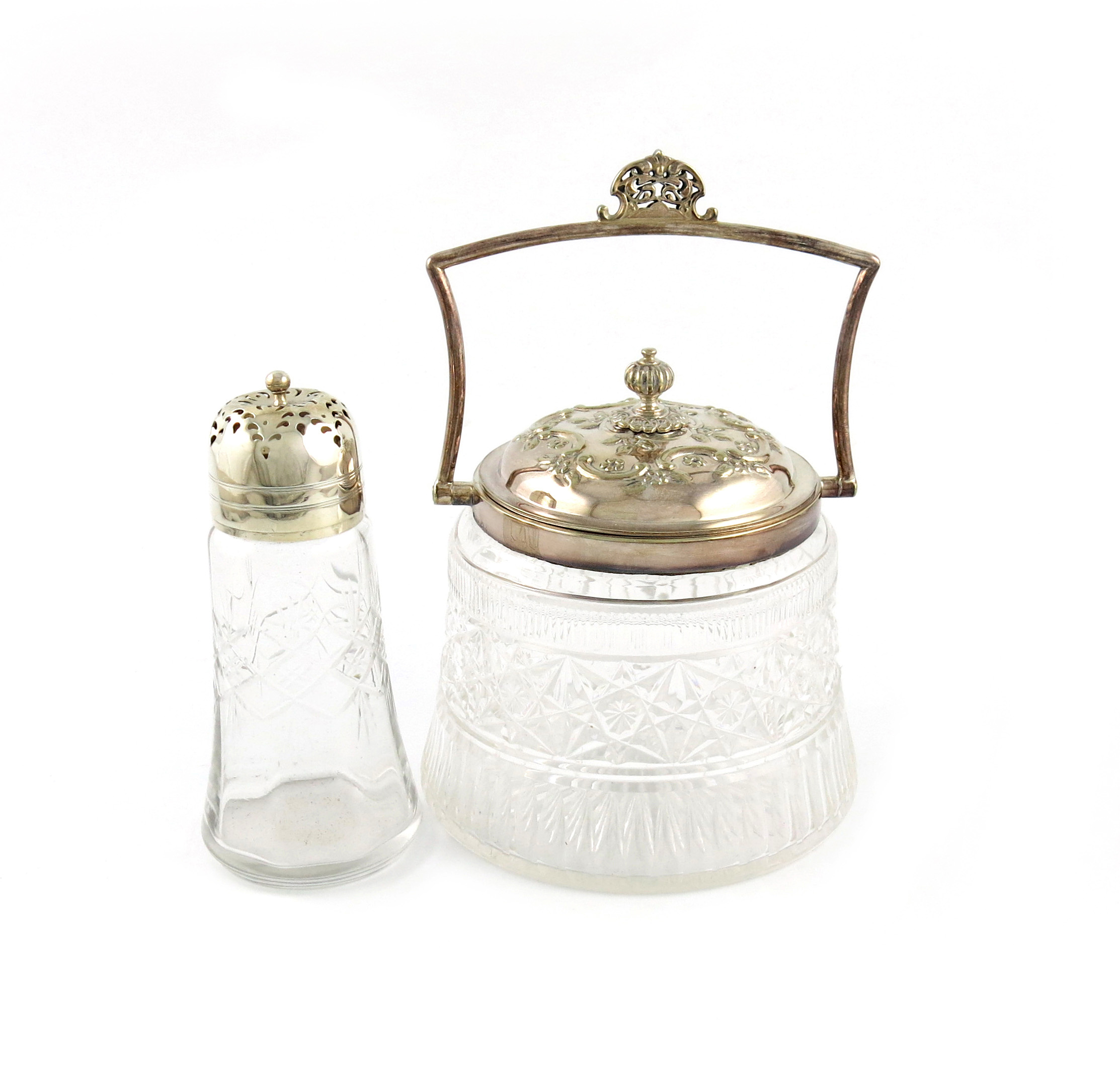 tapering circular form, the mounts with a swing-handle and embossed foliate scroll decoration, plus an electroplated mounted glass sugar caster. (2)