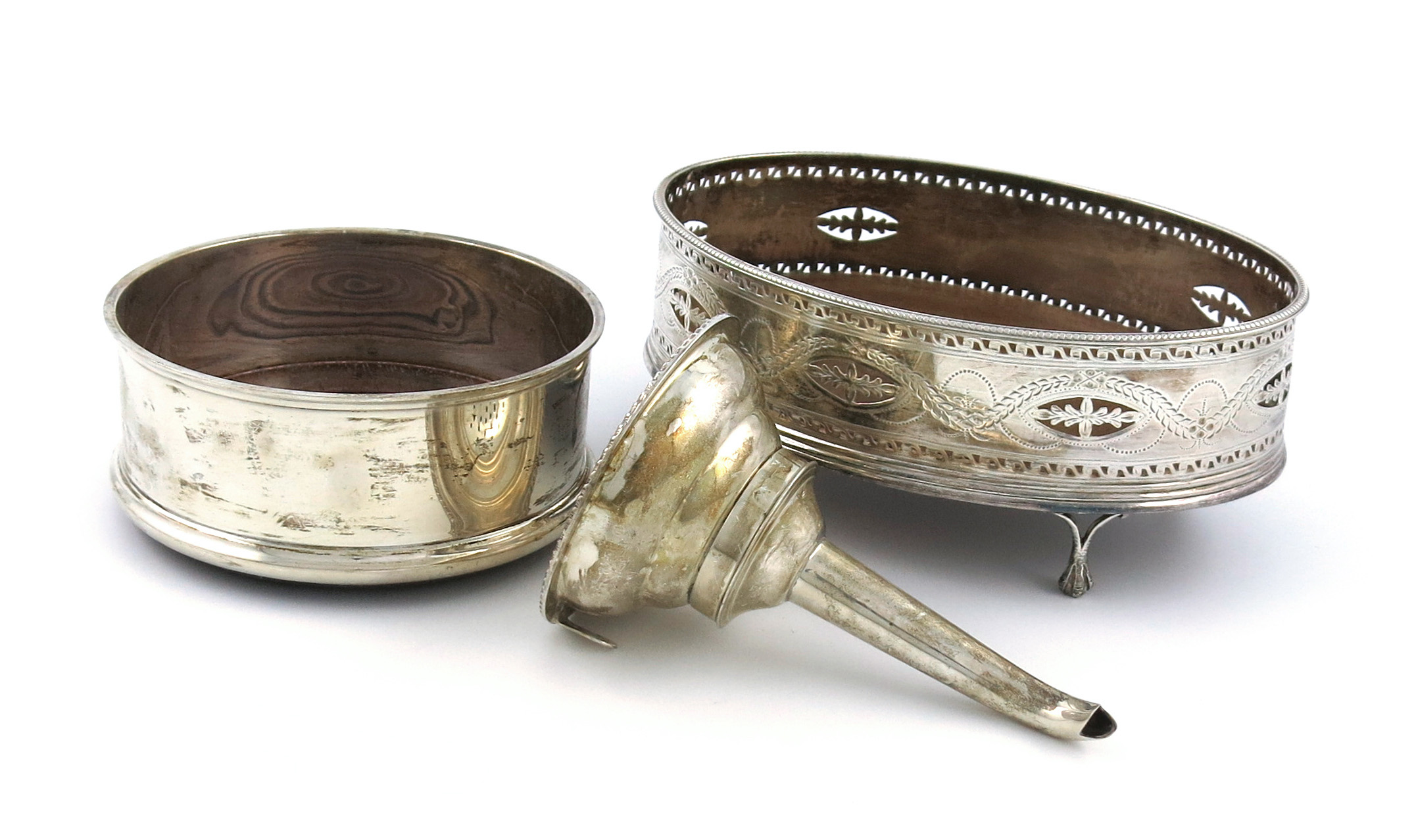 comprising: a modern wine funnel, by Mappin and Webb, Birmingham 1984, plain circular form, with a side clip, plus a wine coaster of circular form, wooden base and a George III cruet frame base, lacking handle, London probably 1786, maker's mark possibly that of Hester Bateman, oval form, bright-cut and pierced decoration, approx. weighable 3.3oz. (3)