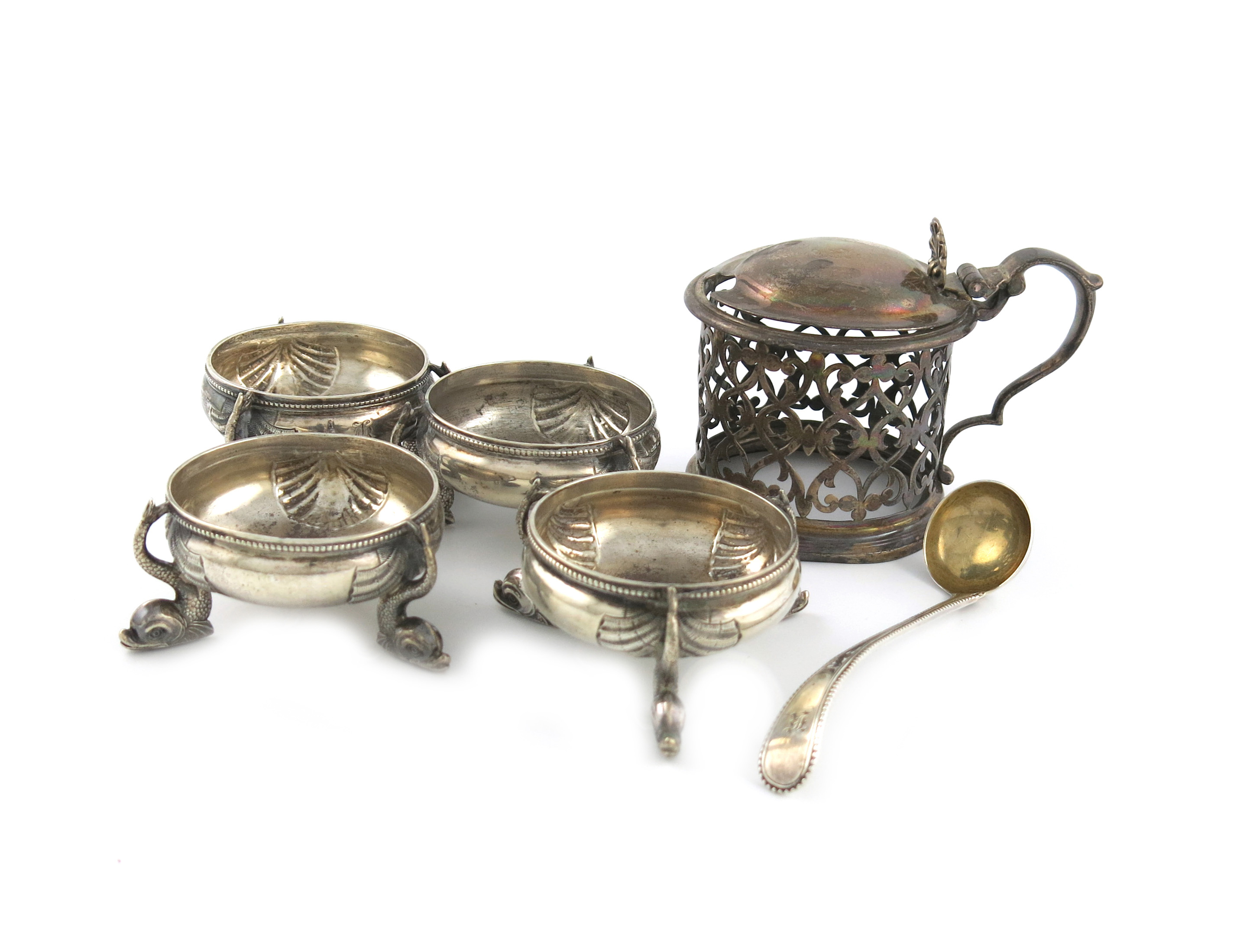 comprising: a Victorian mustard pot, of circular pierced form, lacking liner, London 1843, a set of four salt cellars, on three mythical dolphin feet, Birmingham 1862, and a Bead pattern mustard ladle, approx. weight 9oz. (6)