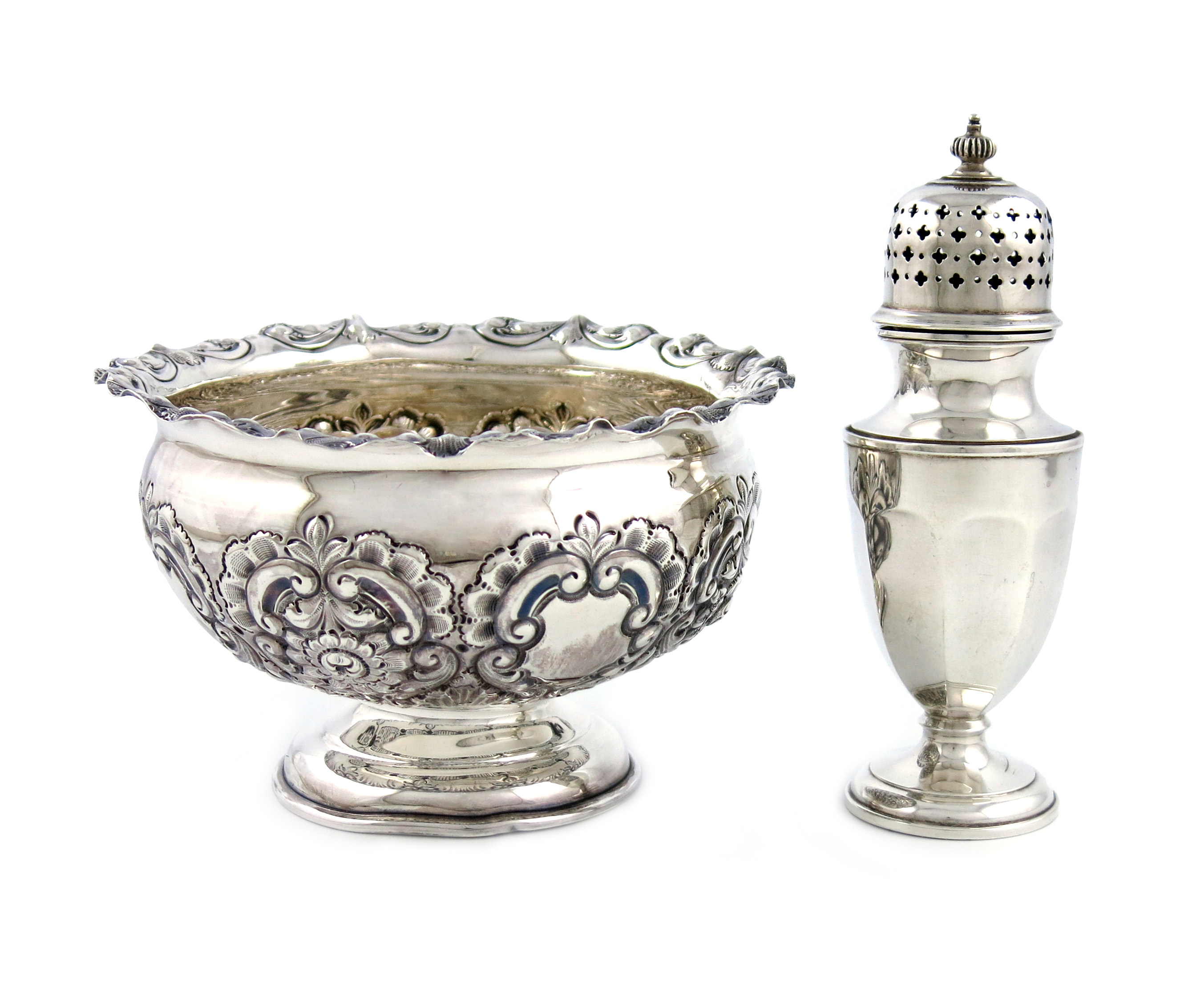 circular form, embossed foliate decoration, foliate scroll border, on a circular foot, diameter 16cm, plus a silver sugar caster, by The Adie Brothers, Birmingham 1933, approx. weight 11.5oz. (2)