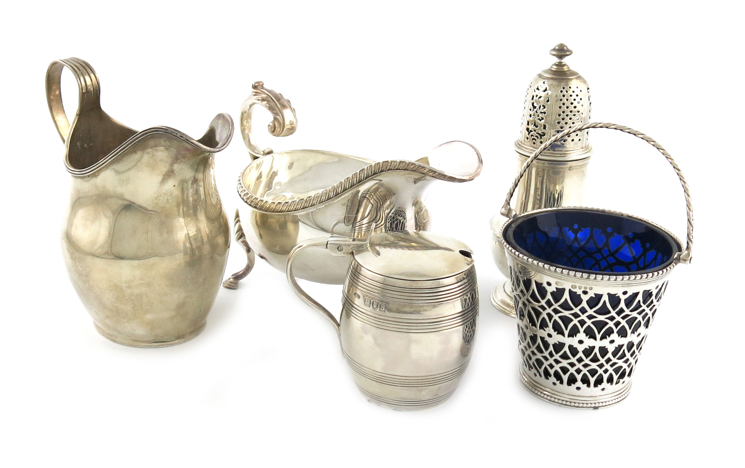 comprising; a George II caster, by Samuel Welder, London 1735, a Victorian swing-handled sugar basket, London 1880, a sauce boat, a cream jug and a barrel shaped mustard pot, London 1913, approx. weight 22.5oz. (5)