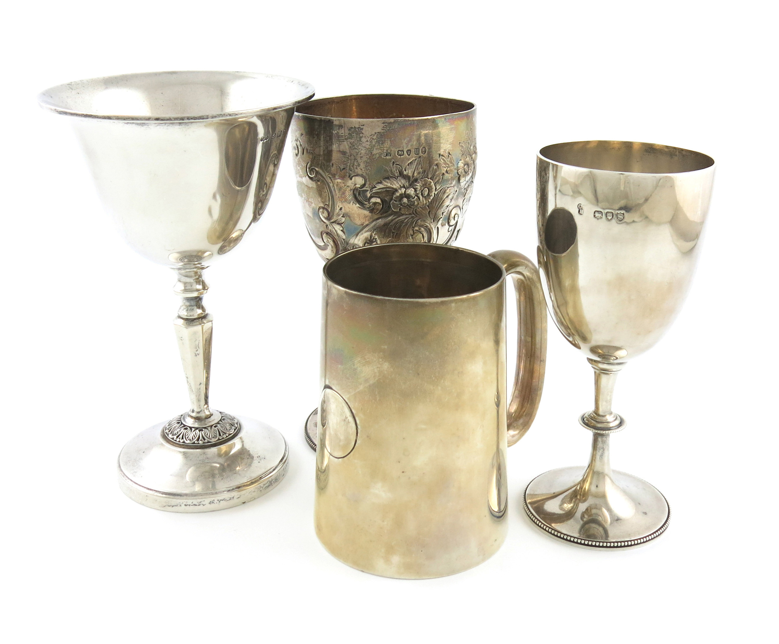 comprising: a Victorian goblet, by D and C Houle, London 1875, embossed decoration, a plain goblet, by Charles Stuart Harris, London 1893, a tapering mug, London 1895, and a goblet, Birmingham 1934, inscribed 'T.S.S "ARANDORA STAR"', approx. weight 24.5oz. (4)
