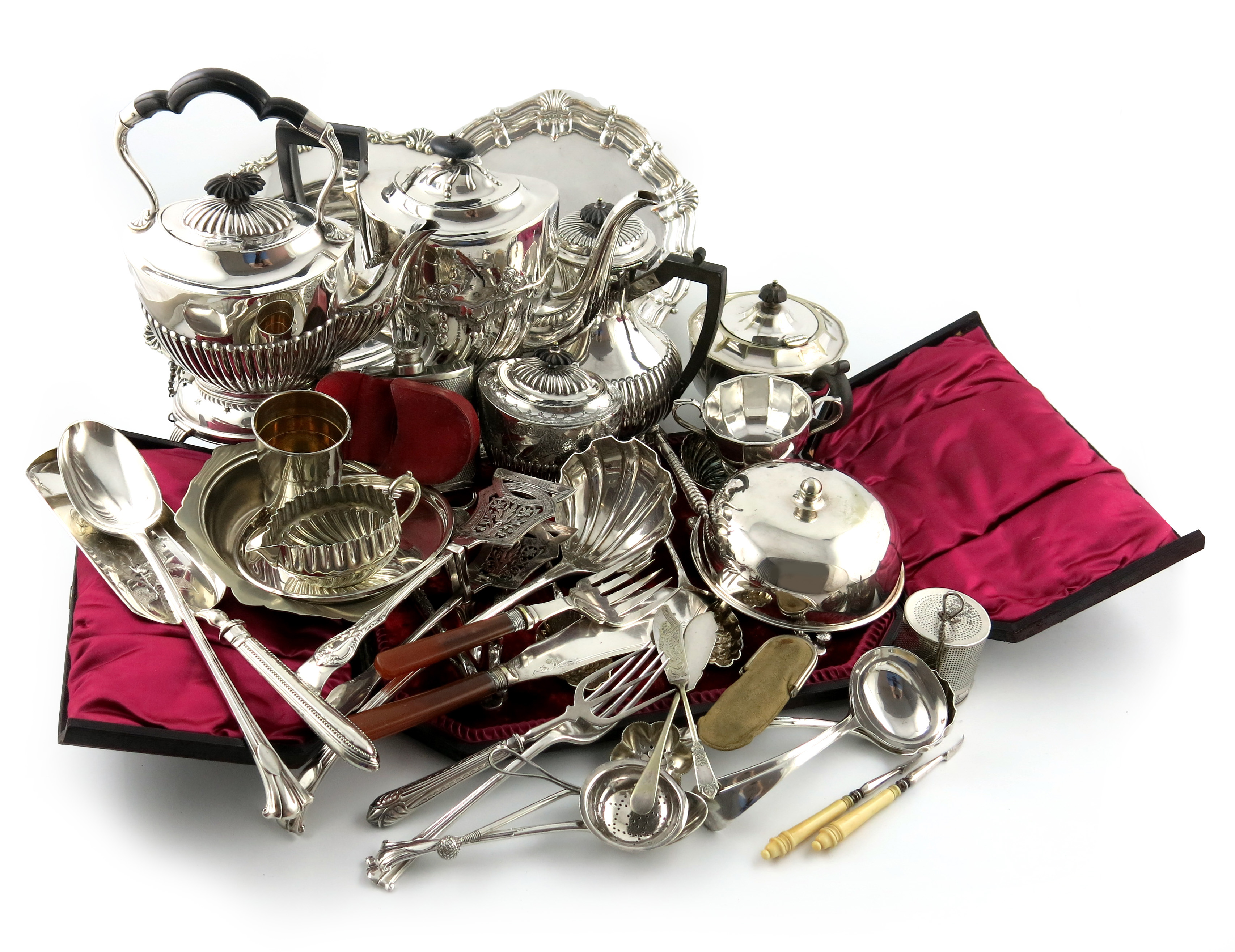 comprising a cased dessert set, including two pairs of nut crackers, two nut picks, a pair of serving spoons, a pair of grape scissors and a sifting spoon, plus a kettle on stand, a salver, a serving dish, a coffee pot, a hot water pot, a caddy, a teapot, a muffin dish and cover, and other items including a quantity of Onslow pattern flatware. (qty)