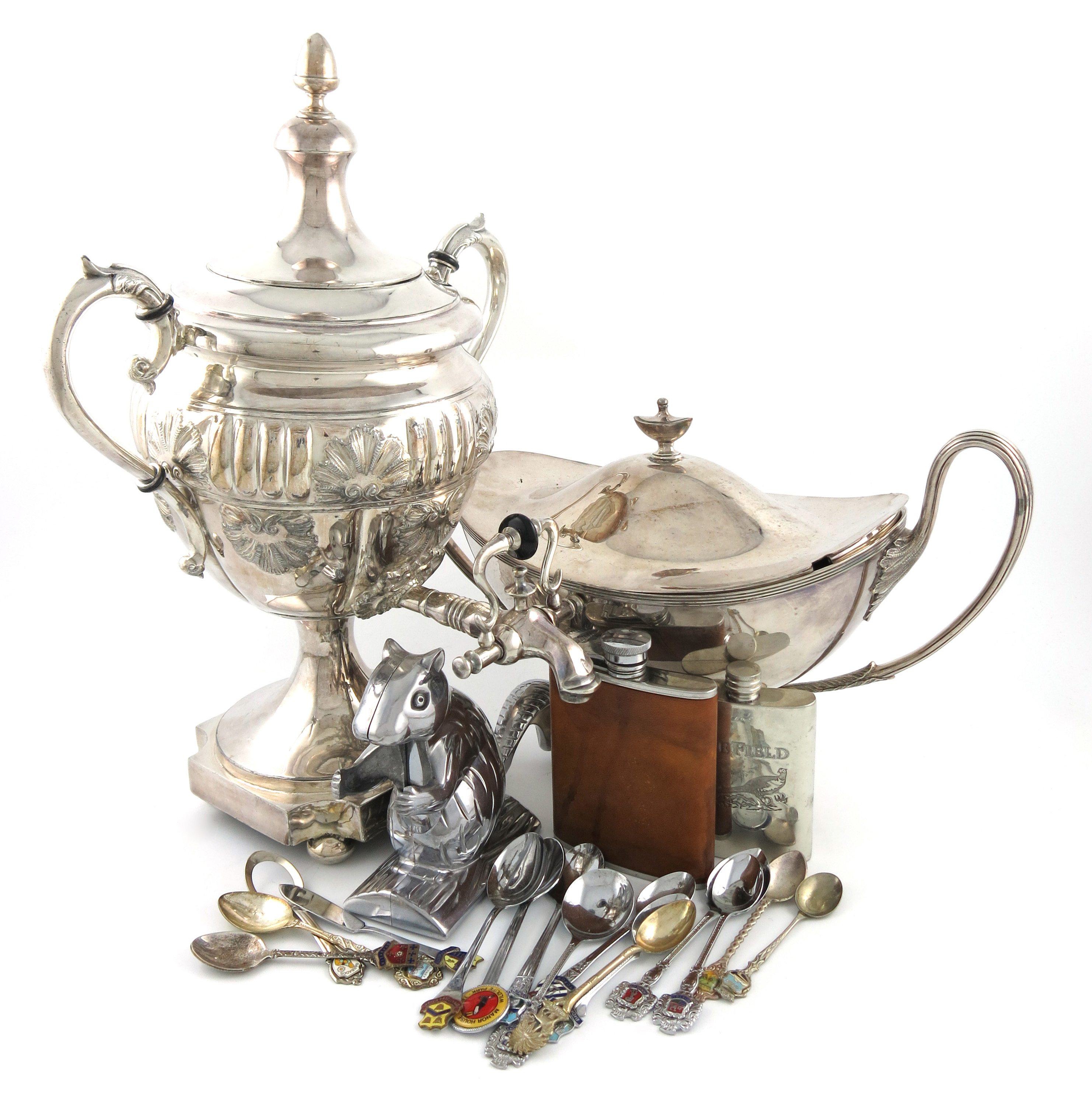 comprising: two meat dish covers, a tea urn, a tureen, a pair of sauce tureen, a biscuit jar, a dish plus other items including a quantity of souvenir spoons, and wooden spoon racks. (qty)