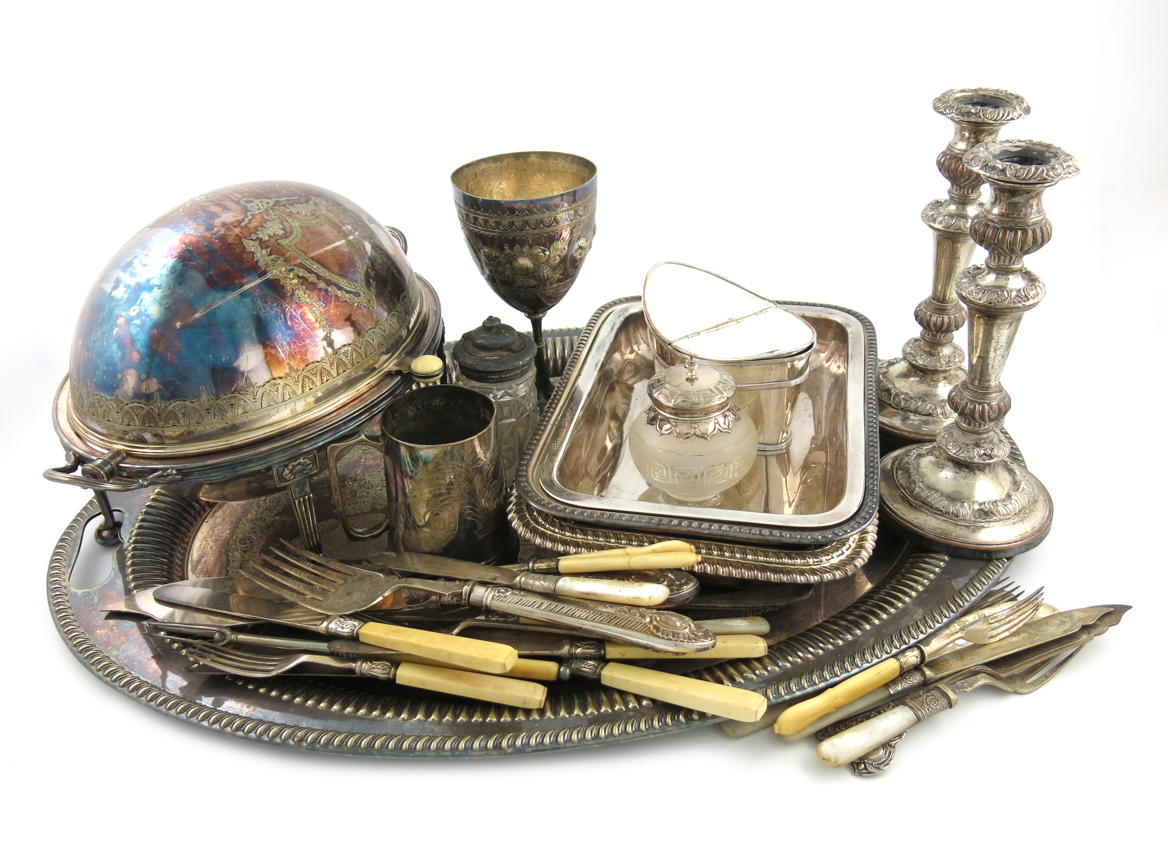comprising: an oval two-handled tray, a pair of candlesticks, various entrée dishes and covers, a goblet, a mug, an inkstand, two toast rack, a chamber stick, two revolving breakfast dishes, an egg cruet stand, a covered sauce boat, and other items including a quantity of flatware. (qty) (Two boxes)