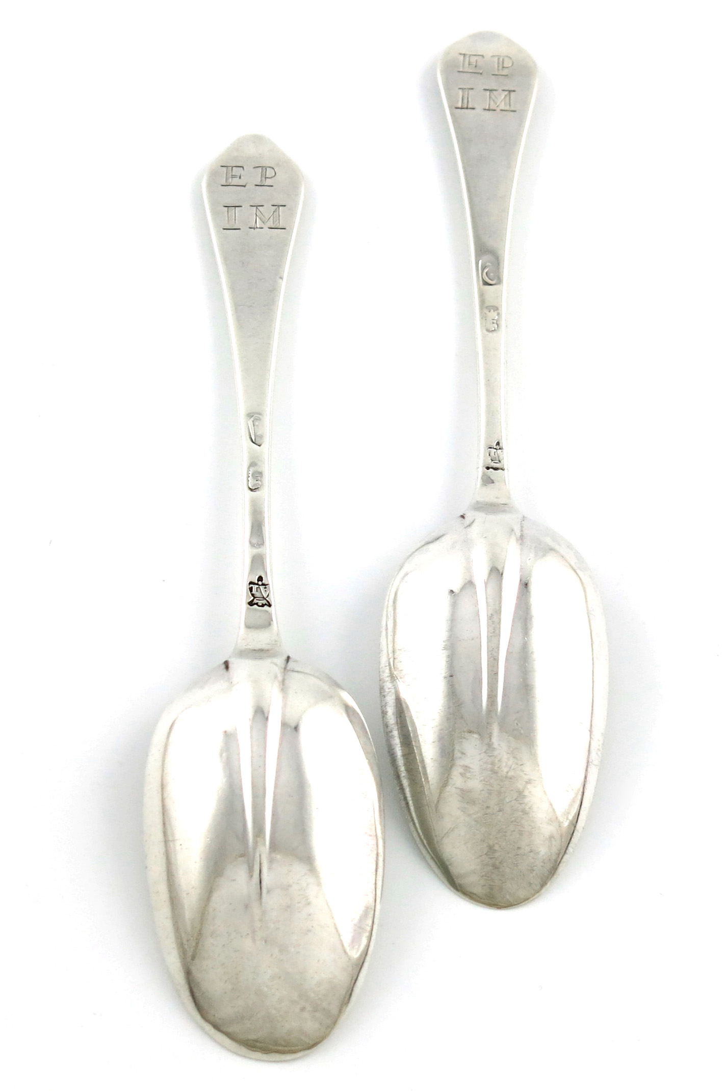 the oval bowl with a plain rat-tail, the reverse of the terminal scratch initialled 'E.P' over 'IM', length 19.8cm, approx. weight 3.6oz. (2)