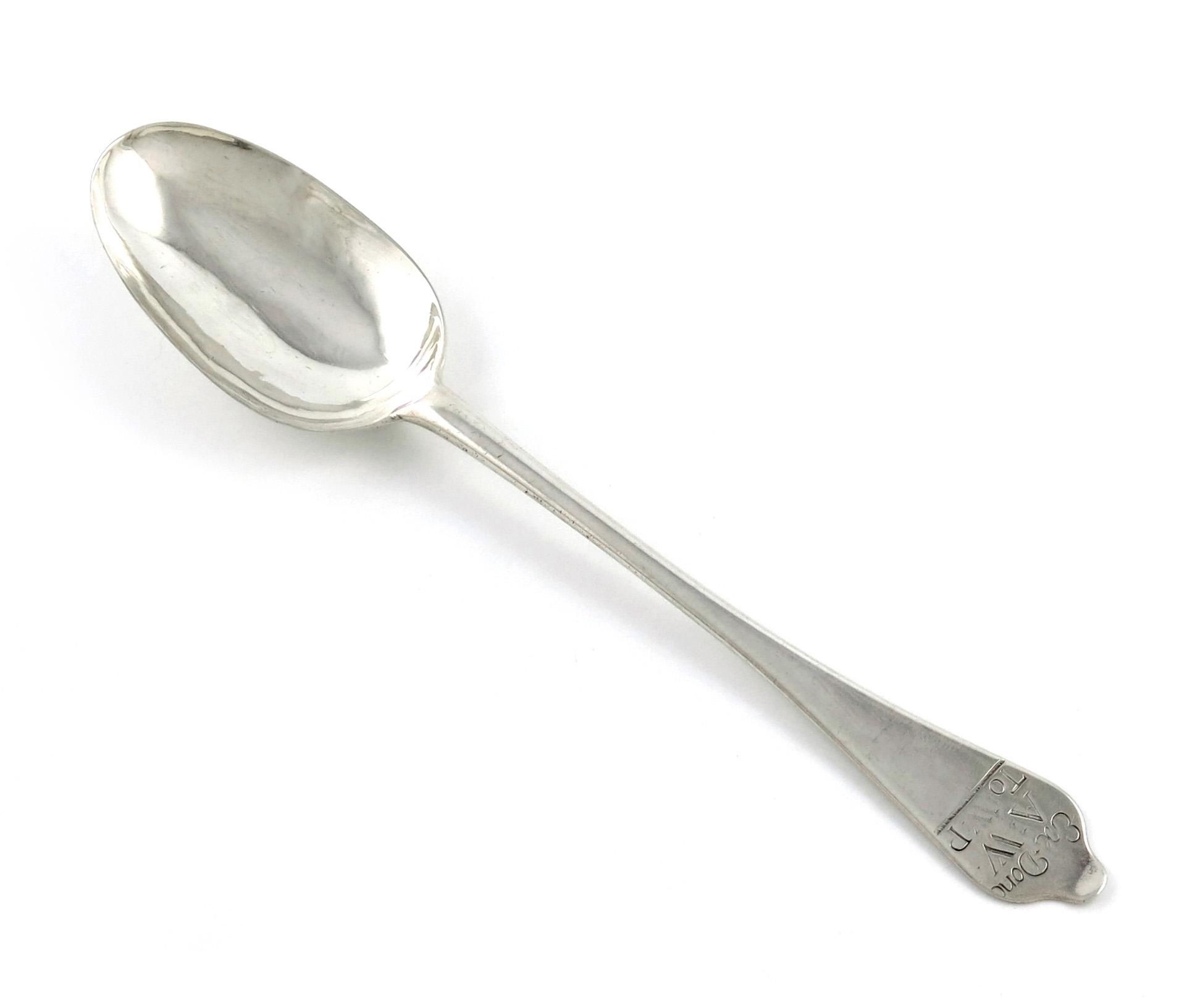 the oval bowl with a plain rat-tail, the reverse of the terminal with scratch initials 'A.W', the front inscribed 'Ex. Dono A.W to W.P', length 27cm, approx. weight 3.4oz.