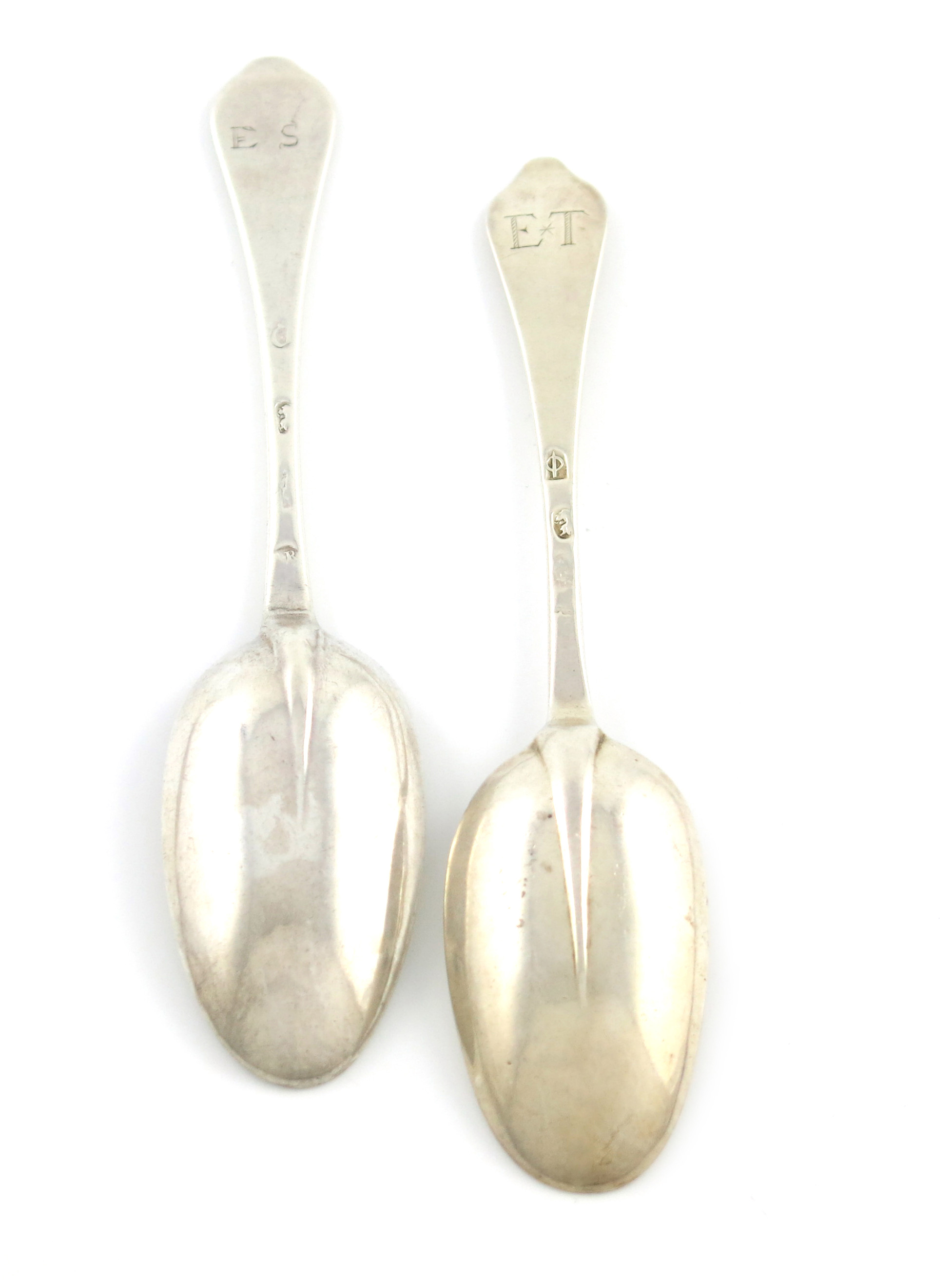 the reverse of the terminal scratch initialled 'E*T', plus another Queen Anne silver Dog-nose spoon, London 1708, the reverse of the terminal scratch initialled 'ES', approx. weight 3.4oz. (2)