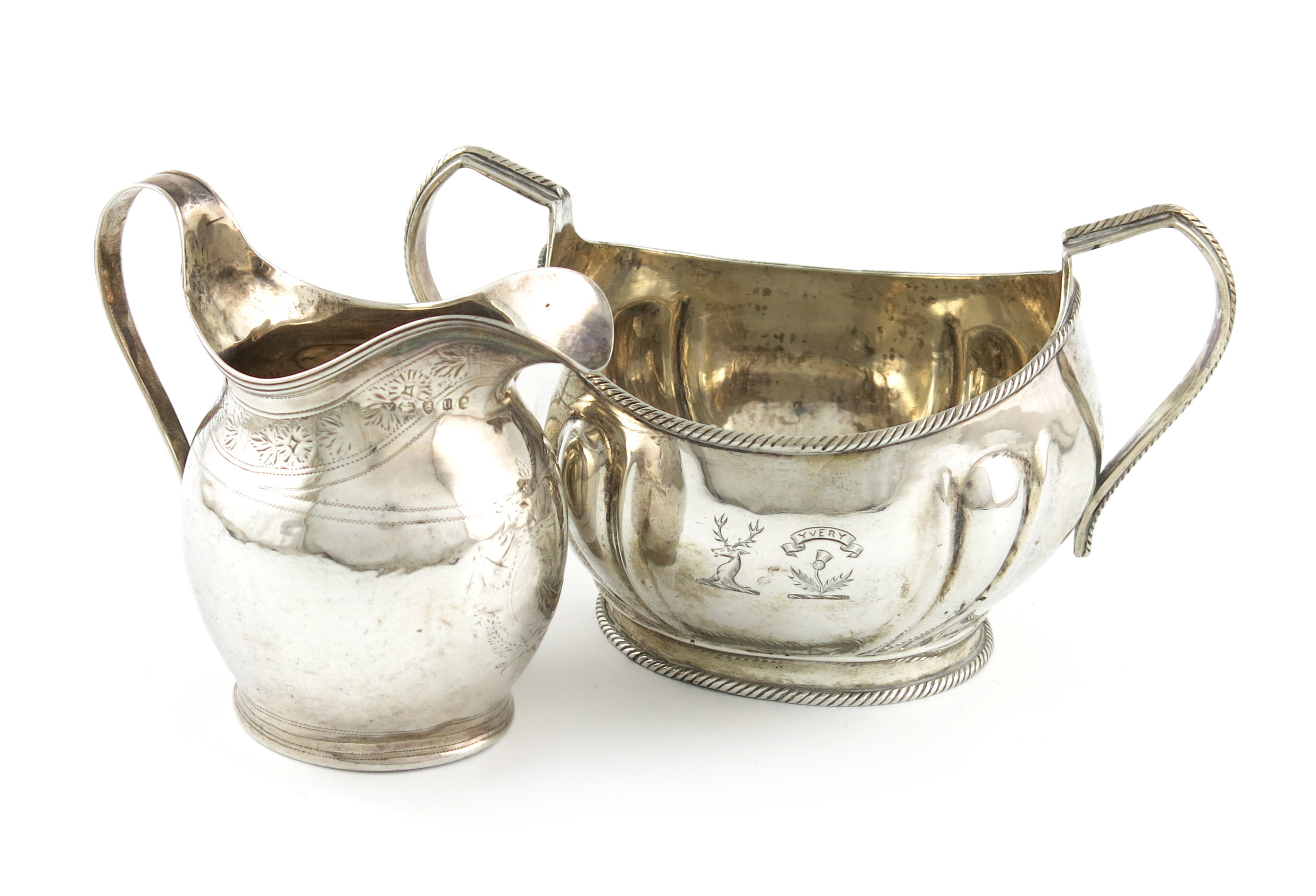 oval bellied form, scroll handle, engraved decoration, the front with a worn crest, plus a George III Irish silver two-handled sugar bowl, by Richard Sawyer, Dublin 1805, oval form, rope-work borders, approx. total weight 13.5oz. (2)