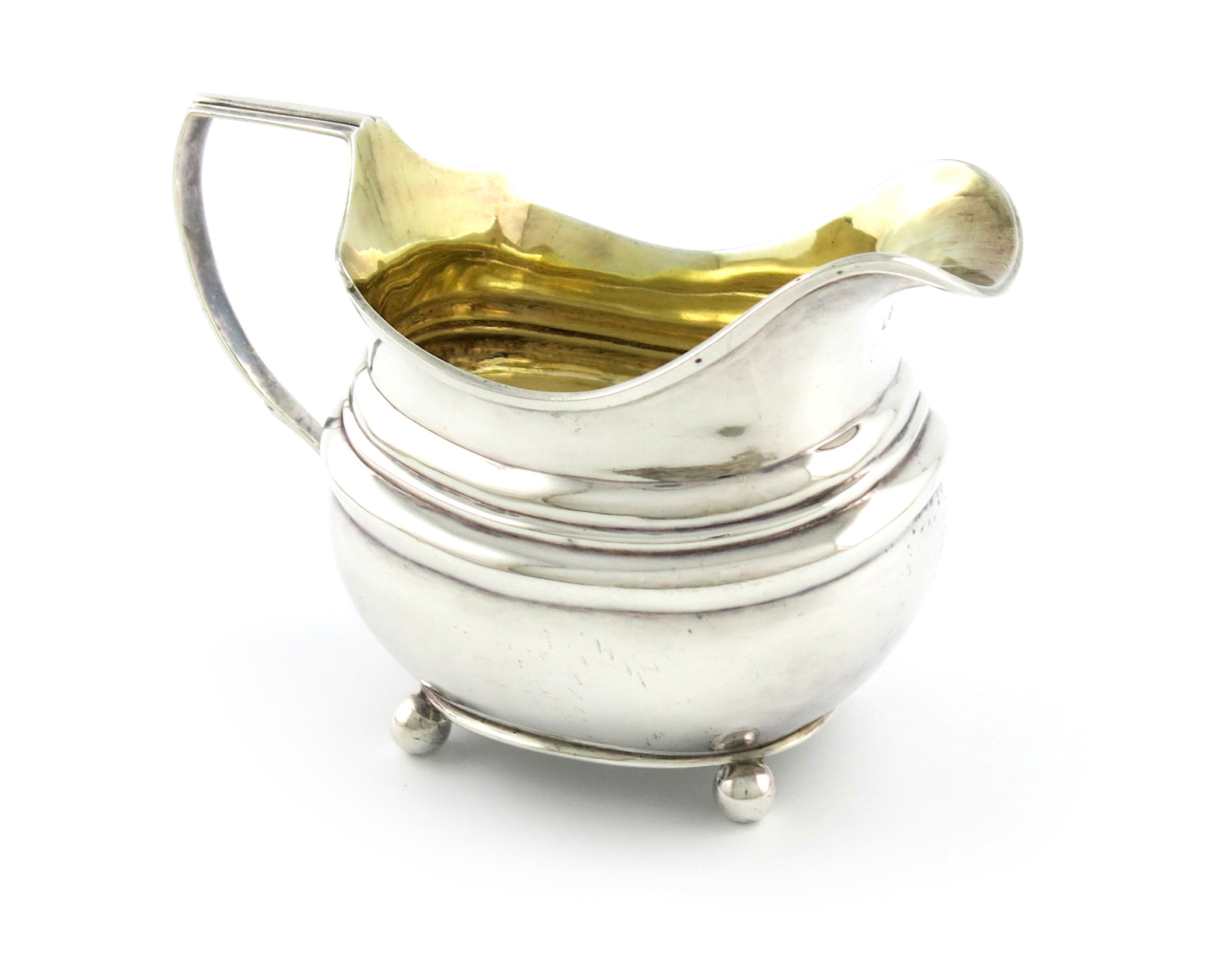 oblong bellied form, scroll handle, gilded interior, on four ball feet, height 9.5oz, approx. weight 6.3oz.