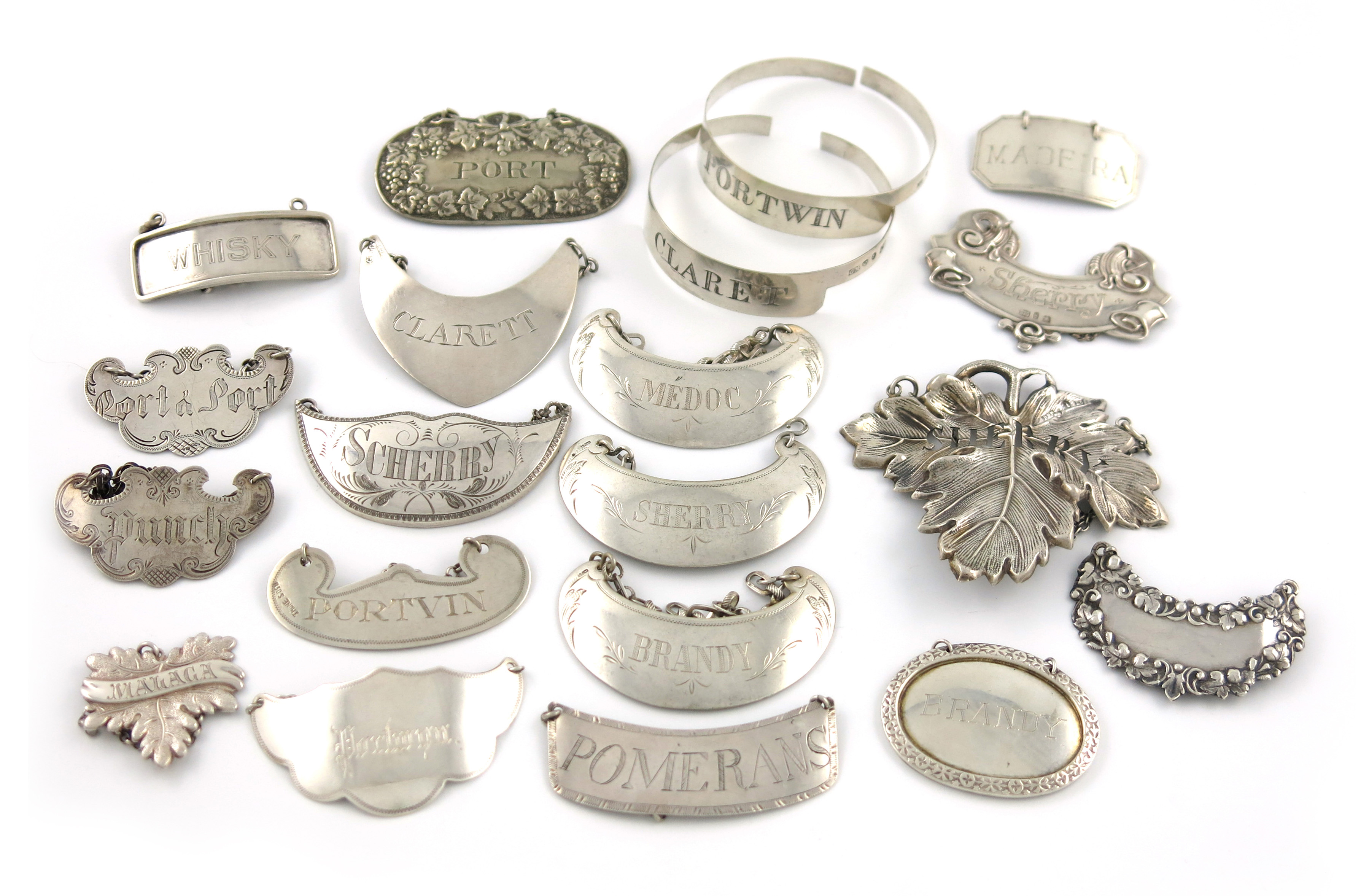 comprising: a Maltese label, oval form, engraved 'BRANDY', an Indian colonial label, by Hamilton and co, incised 'WHISKY', plus Swedish examples and others. (20)