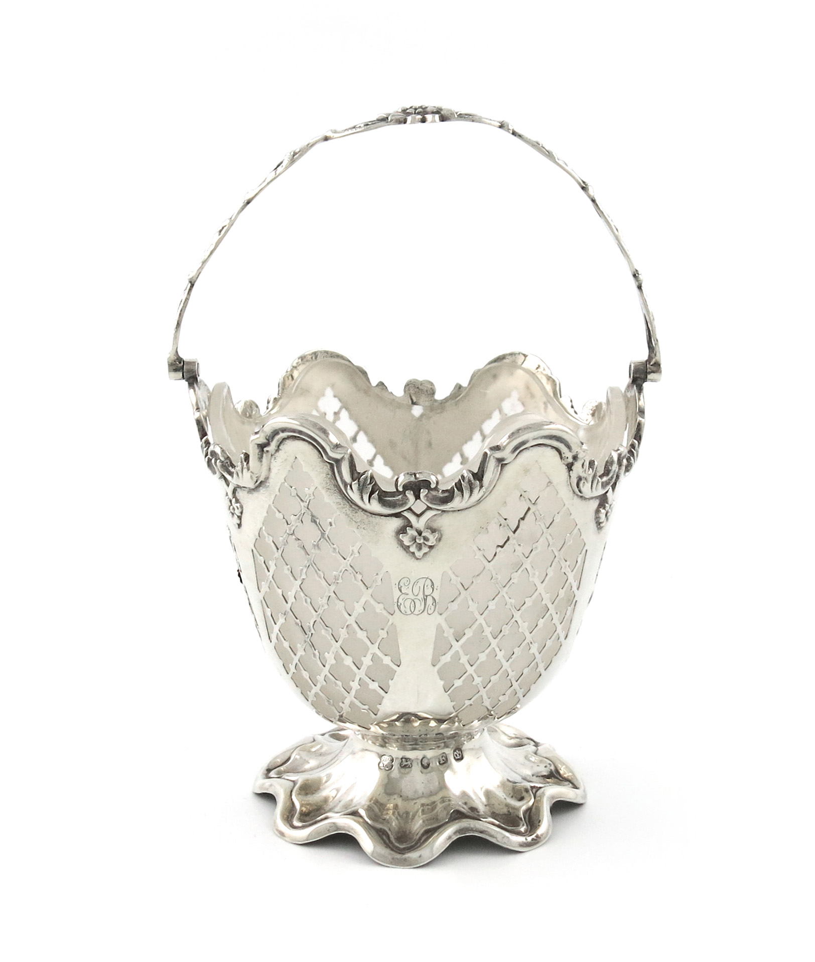 circular form, pierced decoration, scroll border, pierced swing-handle, on a shaped circular foot, with a frosted glass liner, approx. weight 8.1oz.