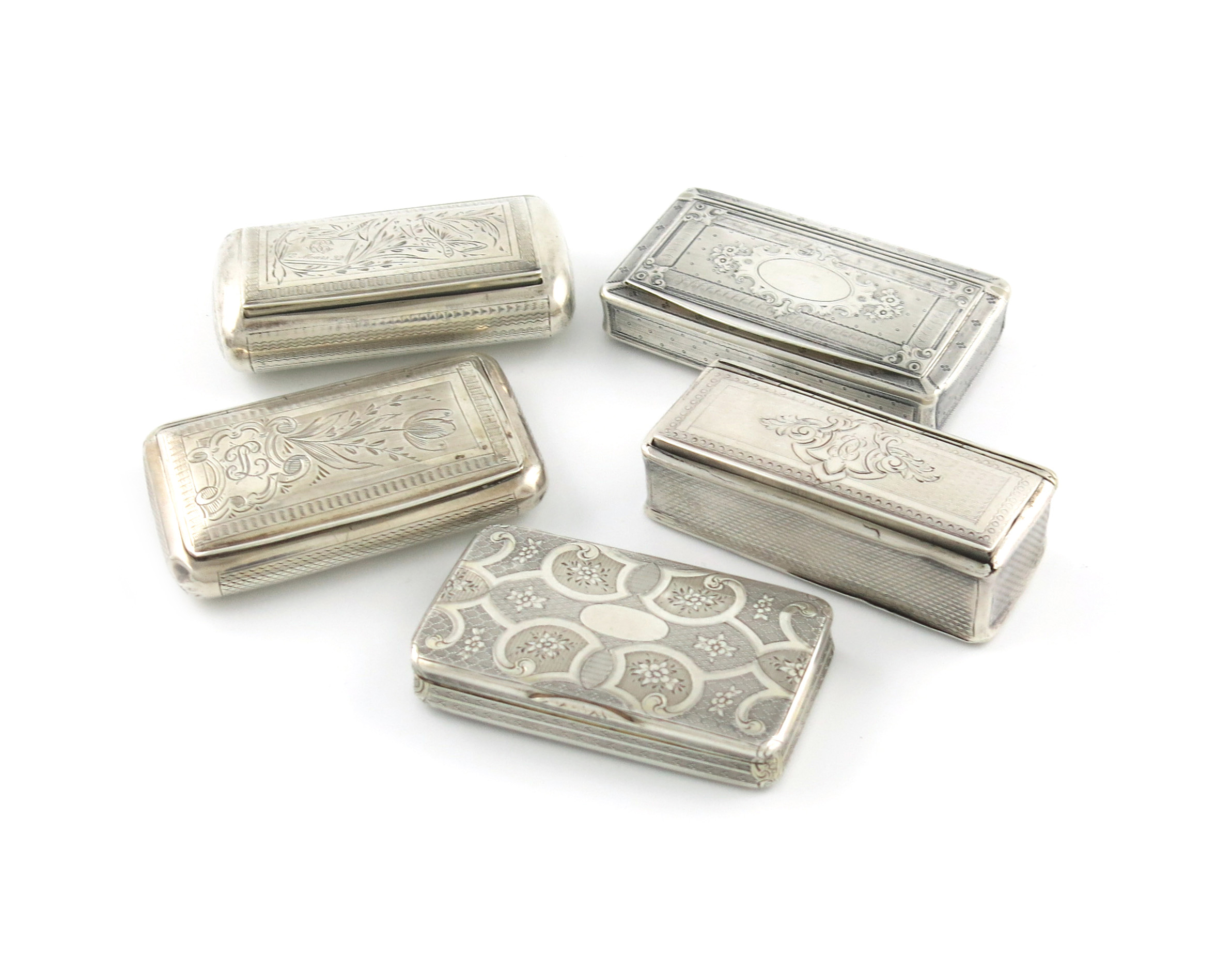 rectangular form, engraved foliate and engine-turned decoration, one with a gilded interior, approx. weight 7.5oz. (5)
