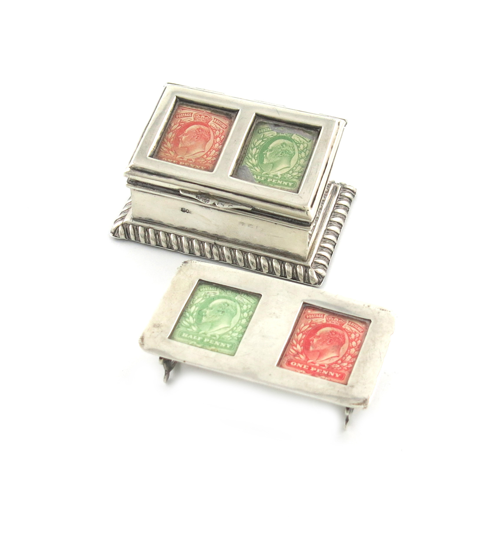 rectangular form, gadroon border, the hinged cover set with two stamps under glass, plus an Edwardian silver double stamp box, by Saunders and Shepherd, Birmingham 1901. (2)