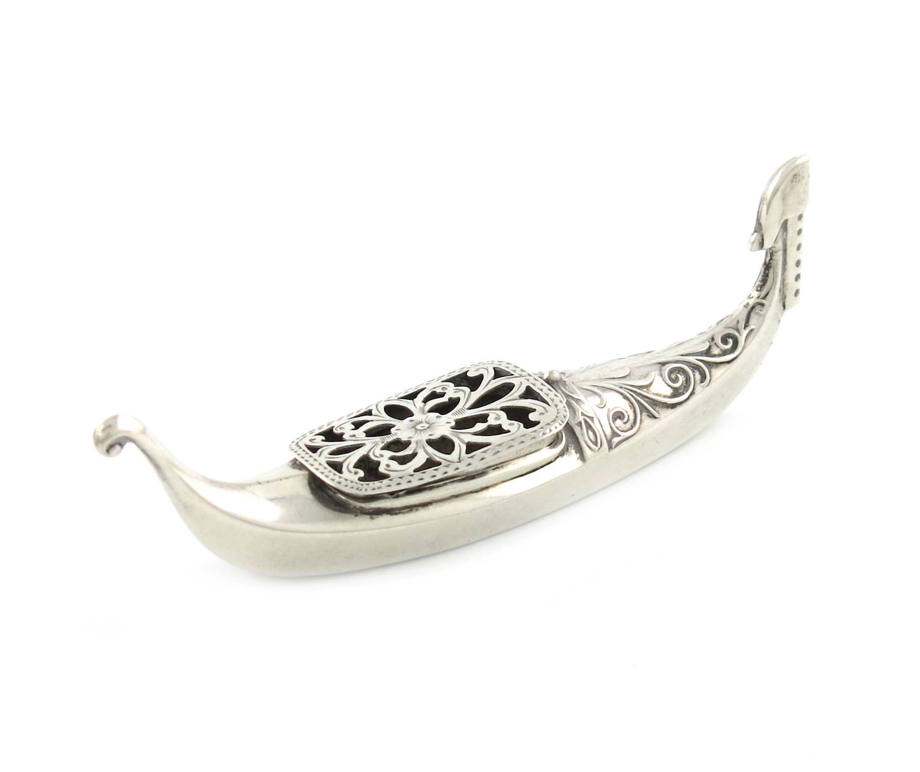 modelled as a gondola, pierced and engraved foliate grille, length 9.5cm, approx. weight 0.3oz.