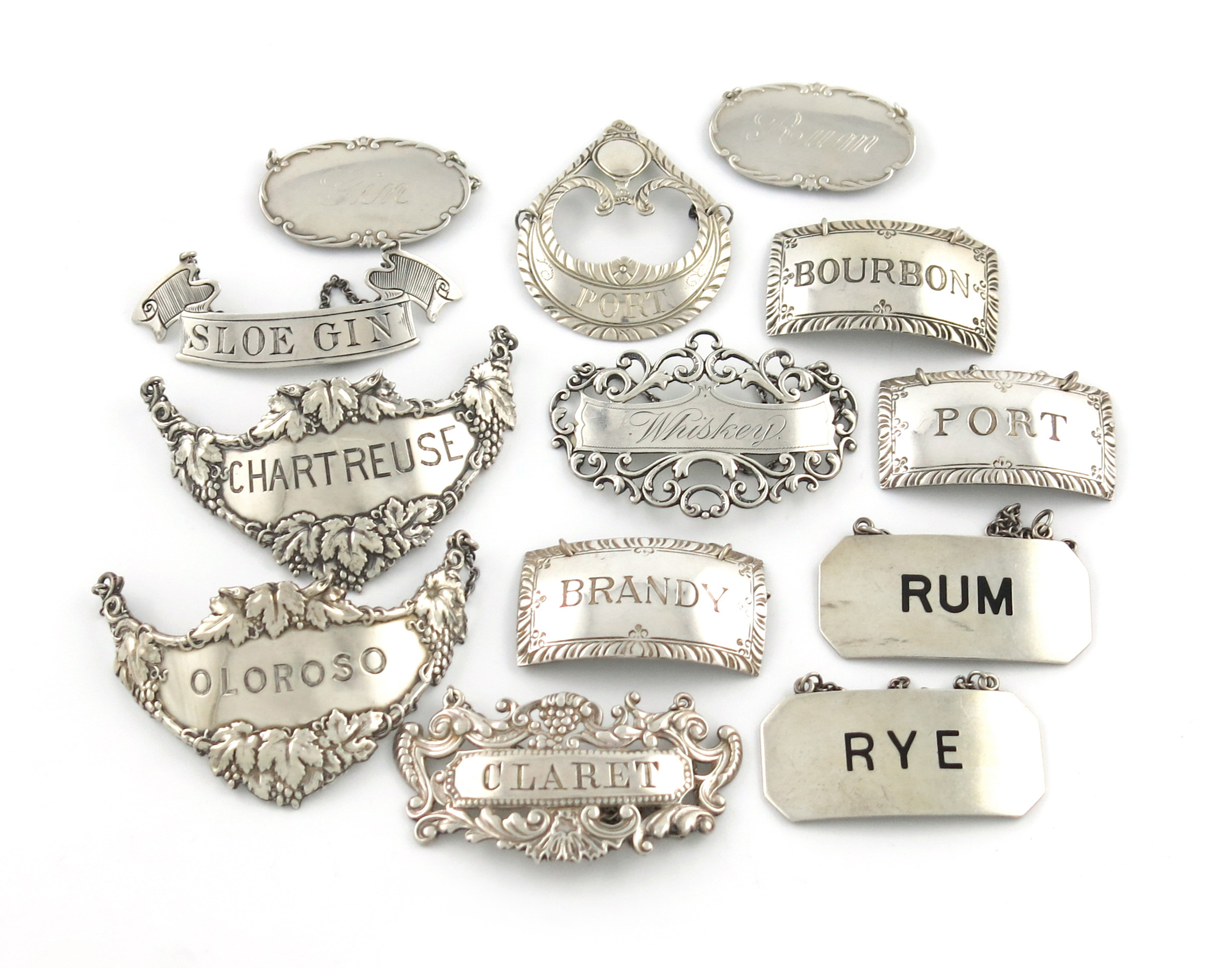 including some by Gorham and co, comprising a matched pair incised 'OLOROSO' and 'CHARTREUSE', plus a set of three 'BOURBON', 'BRANDY' and 'PORT', a pair 'RYE' and 'RUM', plus 'SLOE GIN', 'WHISKEY', 'PORT', 'CLARET' and 'RUM' and 'GIN', approx. weight 5oz. (13)