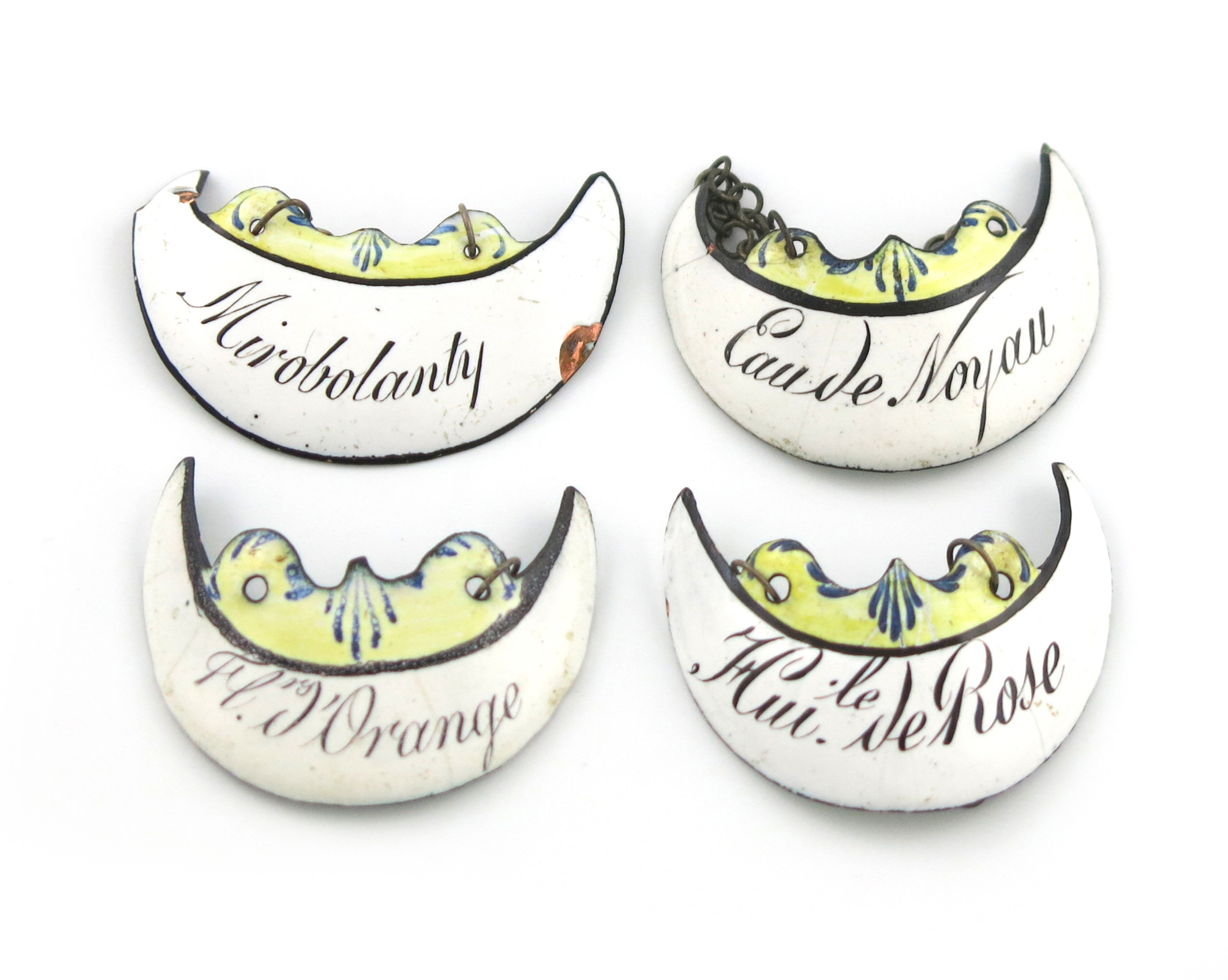 crescent form, titled 'EAY DE NOYAU', 'MIROBOLANTY', 'HUILE DE ROSE' and 'FLEURS D'ORANGE'. (4)