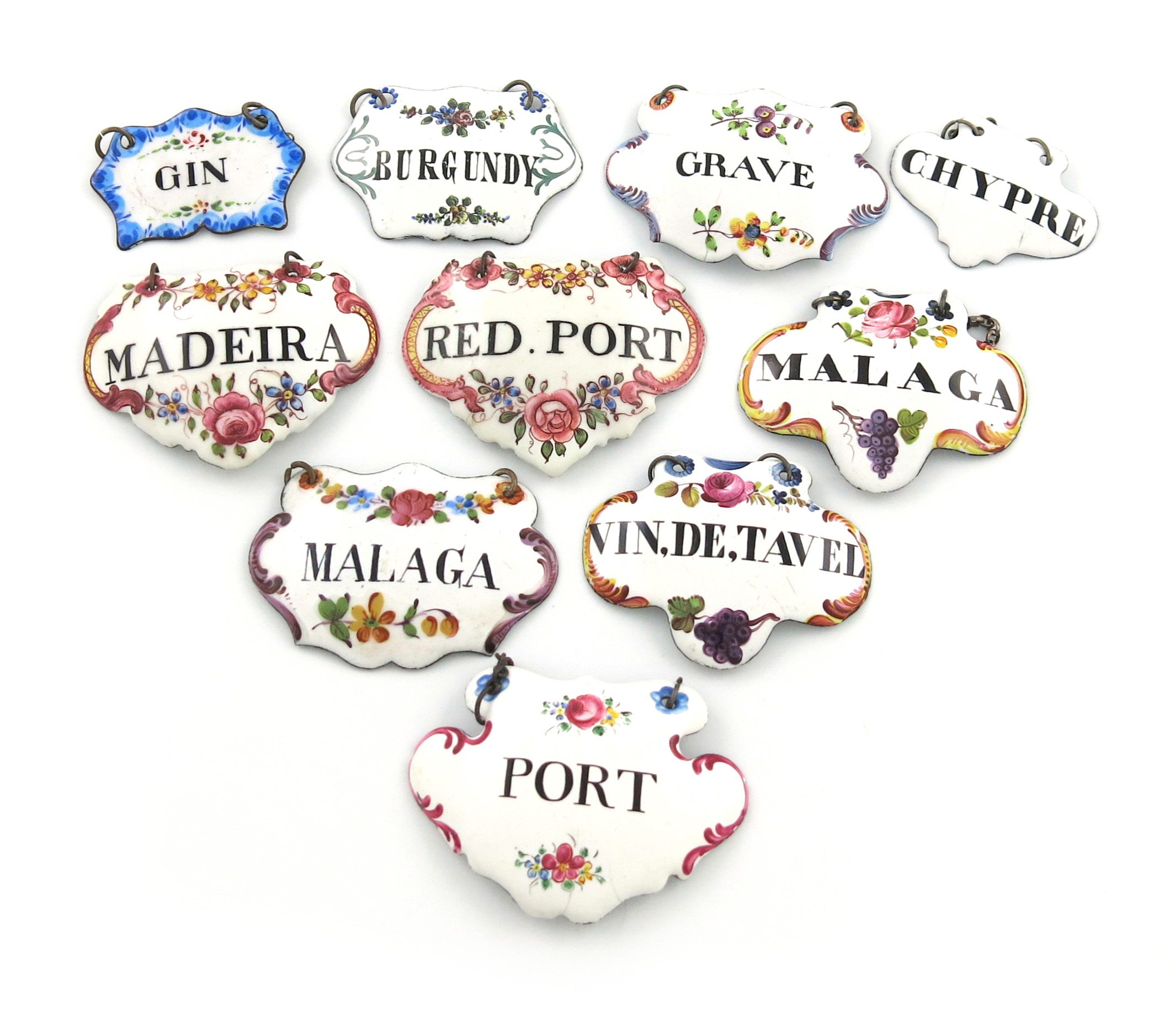 A collection of ten enamelled wine labels,