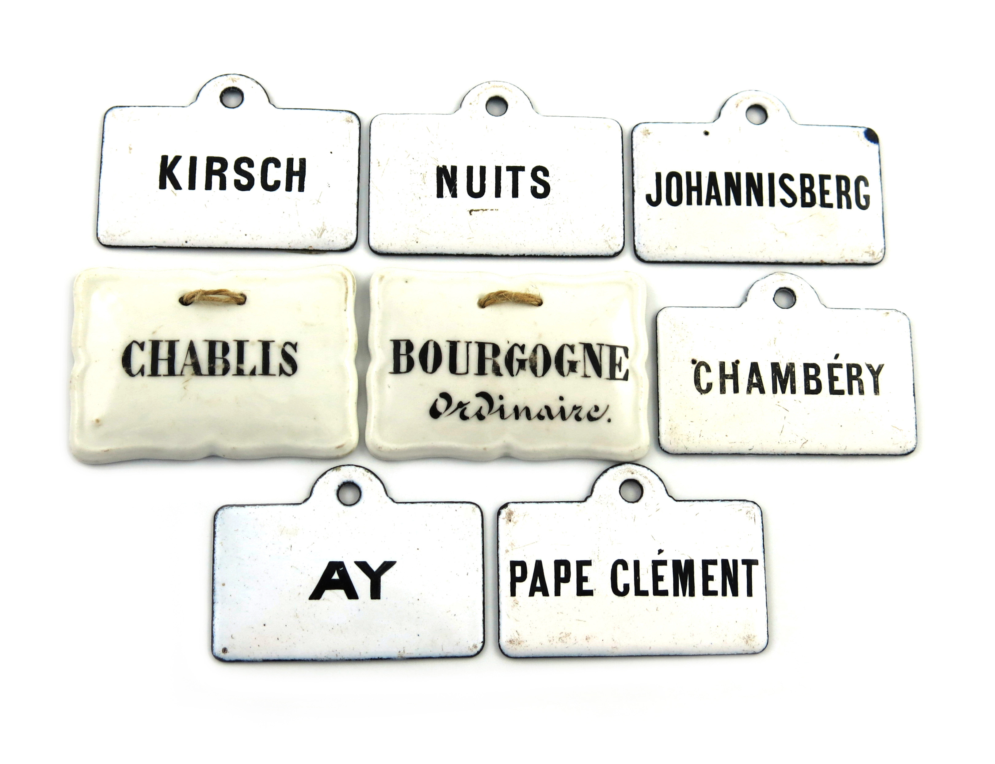 arched rectangular form, titled 'KIRSCH', 'NUITS', 'JOHANNISBERG', 'CHAMBERY', 'AY' and 'PAPE CLEMENT', length 7.2cm, plus two French ceramic labels, 'CHABLIS', 'BOURGOGNE ORDINAIRE'. (8)