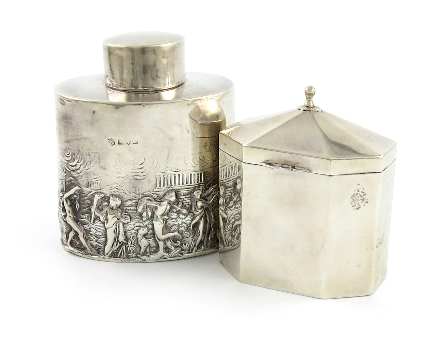 oval form, pull-off cover, the base with a frieze of classical figures, height 10.2cm, plus another silver tea caddy, Birmingham 1907, panelled rectangular form, approx. weight 8oz. (2)