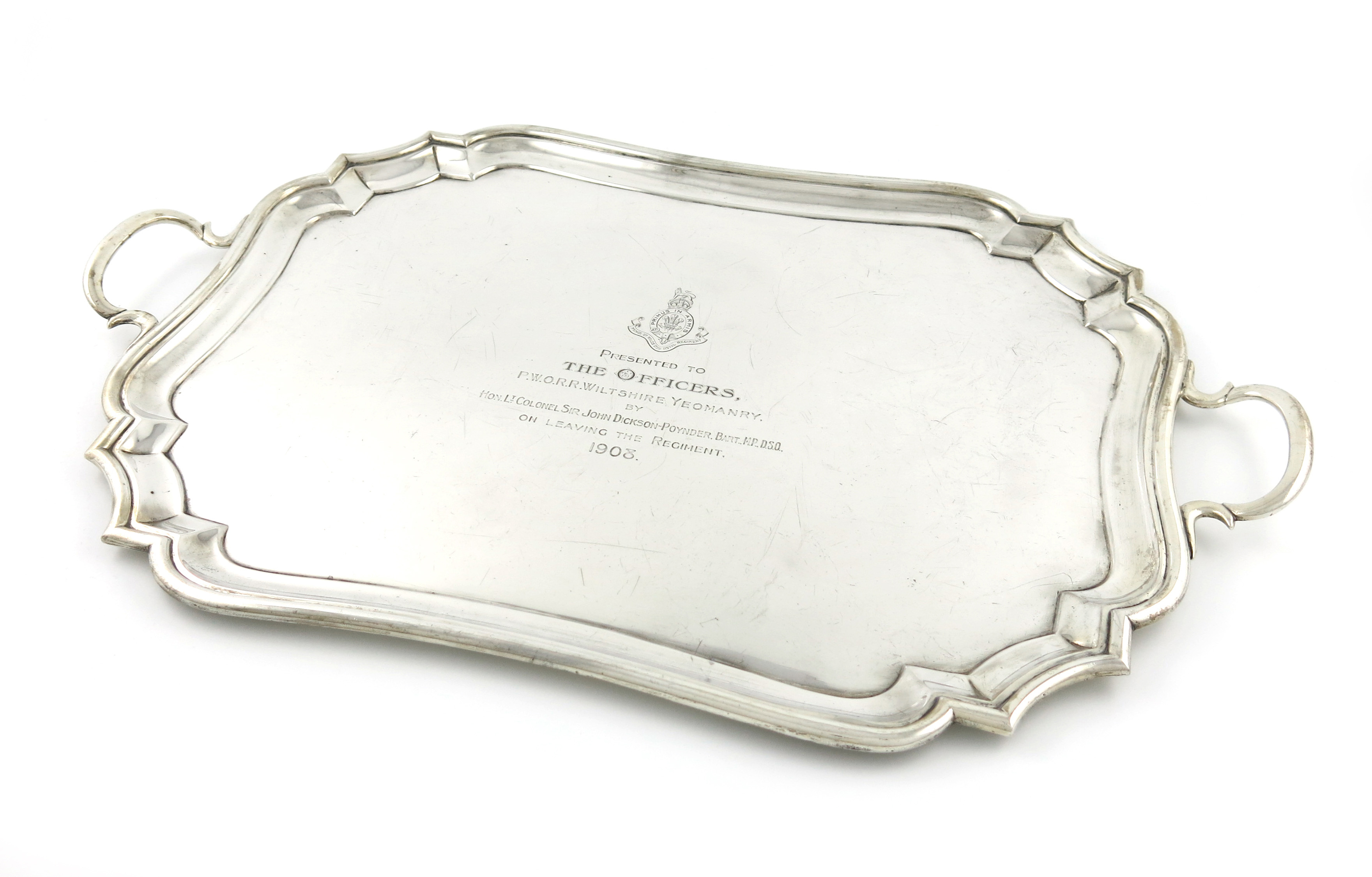 rectangular form, canted corners, moulded border, inscribed with a regiment badge and 'Presented to the Officers P.W.O.R.R Wiltshire Yeomanry by The Hon. Lt. Colonel Sir John Dickson-Poynder, Bart. M.P, D.S.O on leaving the Regiment, 1908', scroll handles, length 61.5cm, approx. weight 91oz.