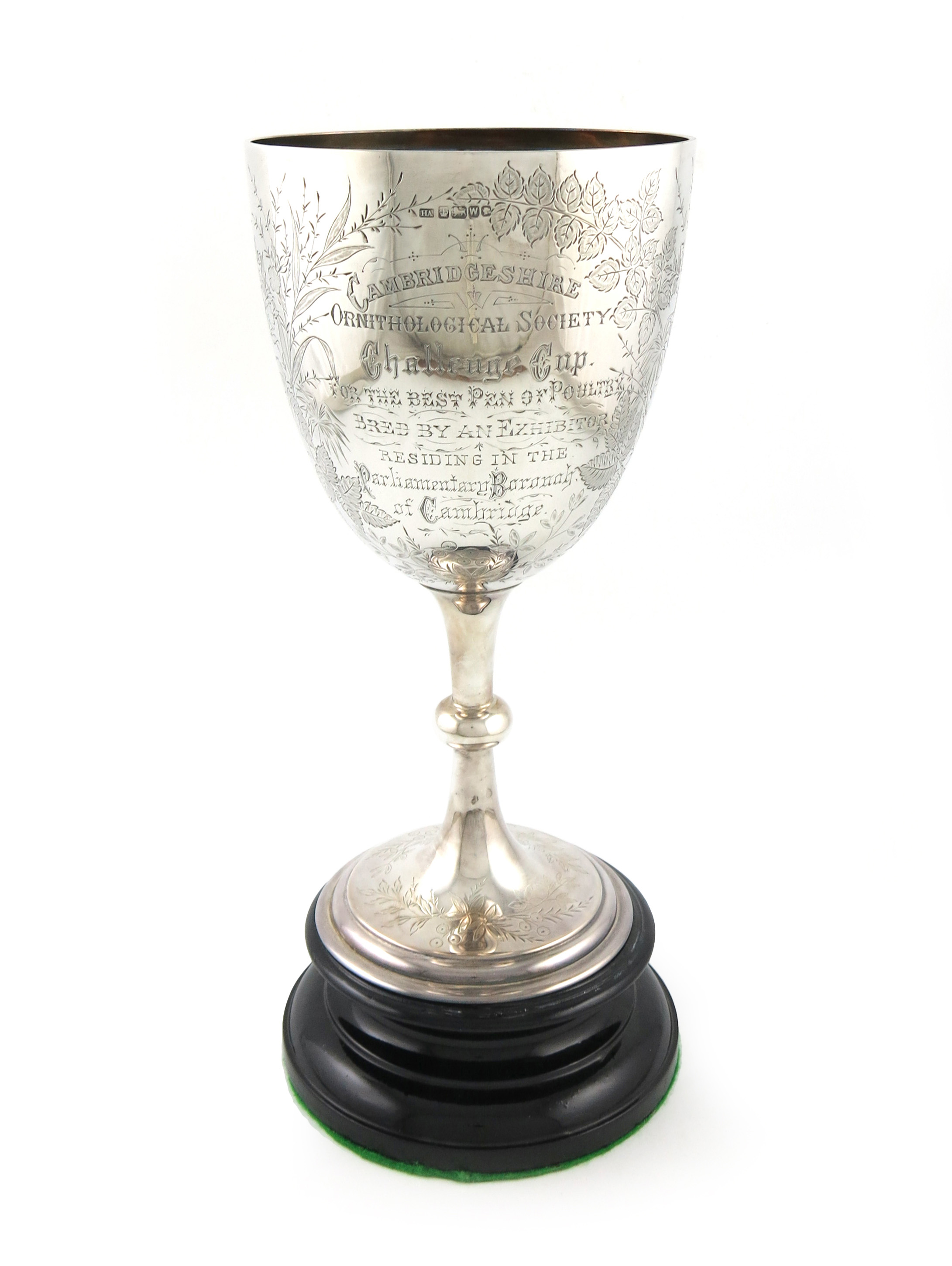 vase form, engraved foliate decoration, inscribed 'Cambridgeshire Ornithological Society Challenge Cup, For The Best Pen of Poultry Bred by an Exhibitor Residing In the Parliamentary Borough of Cambridge', height off plinth, 30.3cm, approx. weight 22oz.