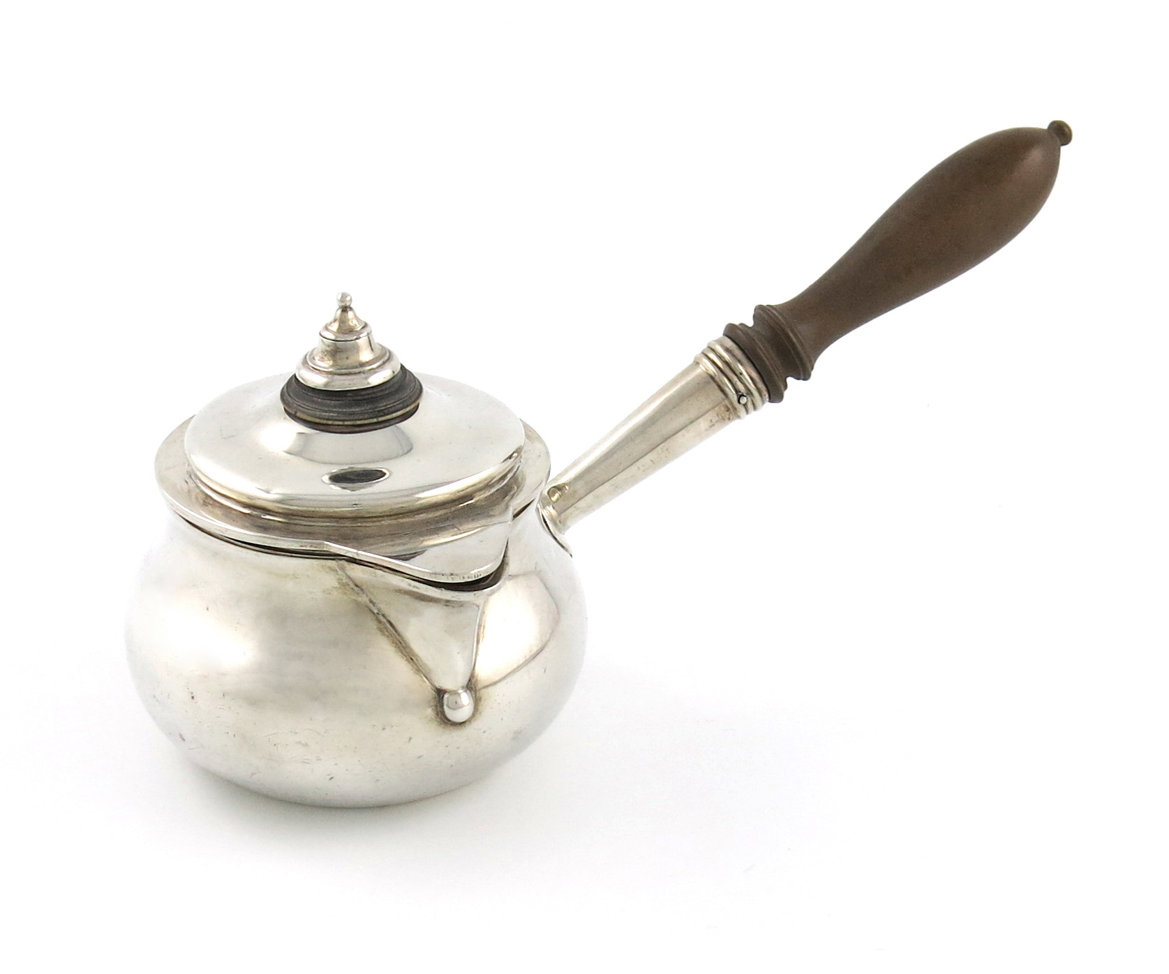 circular baluster form, turned wooden baluster handle, the pull-off cover with an ivory finial and hinged spout cover, length 22.5cm, approx. weight 9.2oz.