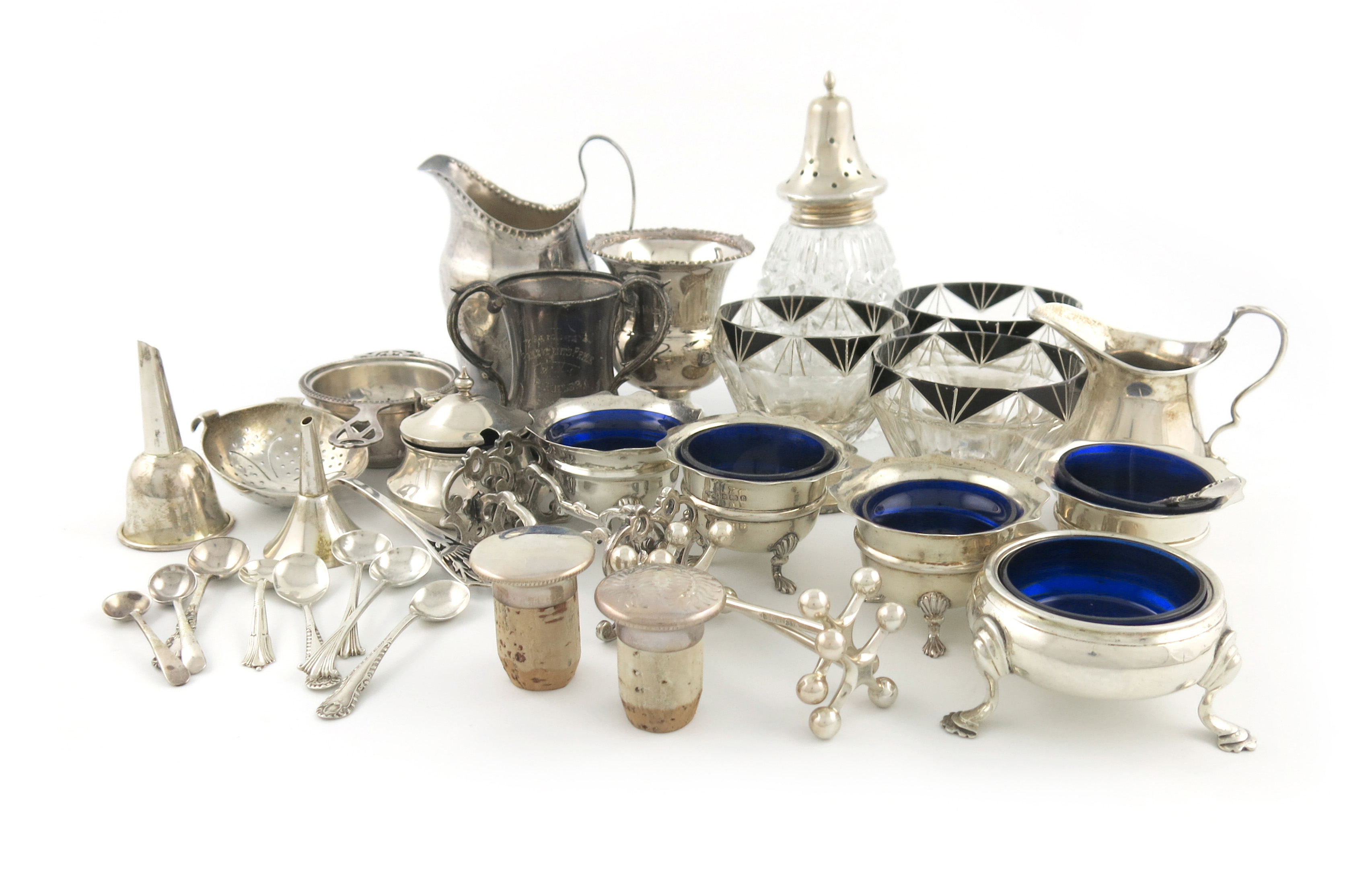 comprising: a George III cream jug, London 1797, a small cream jug, a three handled cup, a George II salt cellar, four salt cellars, a tea strainer and stand, another tea strainer, two small funnels, a small urn, a silver-mounted glass sugar caster, a mustard pot, two pairs of knife rests, three German silver-mounted glass dishes, and nine condiment spoons, approx. weighable 27oz. (qty)