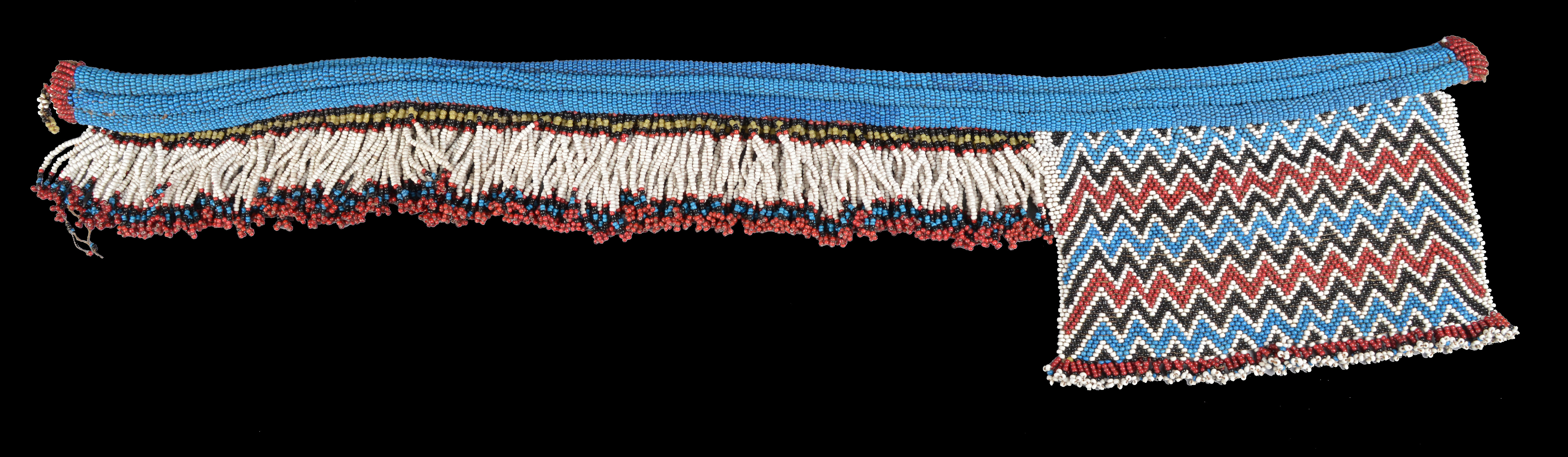 A Zulu beaded waistband South Africa with three cylindrical rows hung with a rectangular panel...