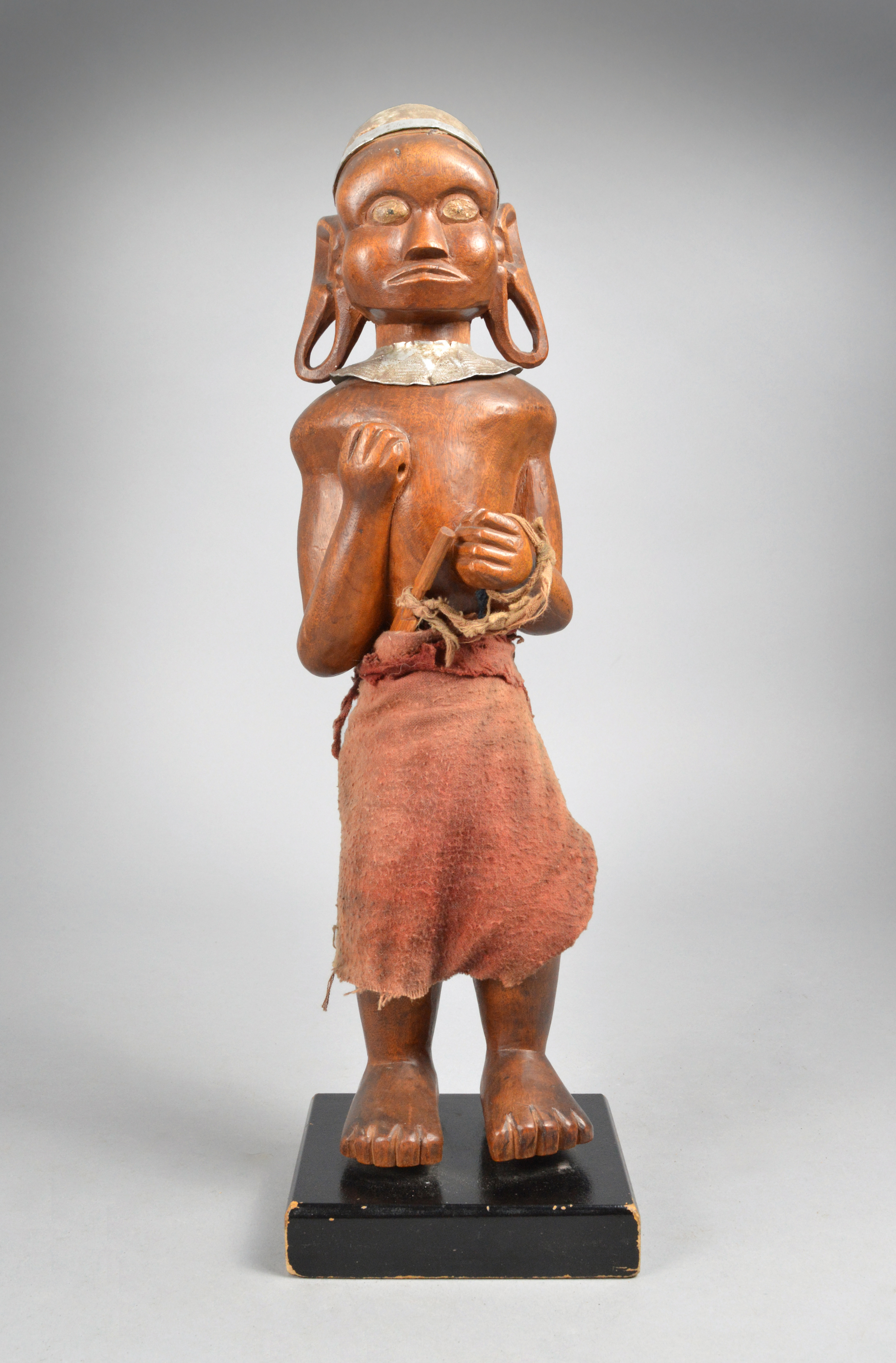 standing, with an applied hide coiffure, inset eyes and large pierced ear lobes, wearing an aluminium neck piece and headband, the hands pierced and with a large loin cloth covering his penis,
