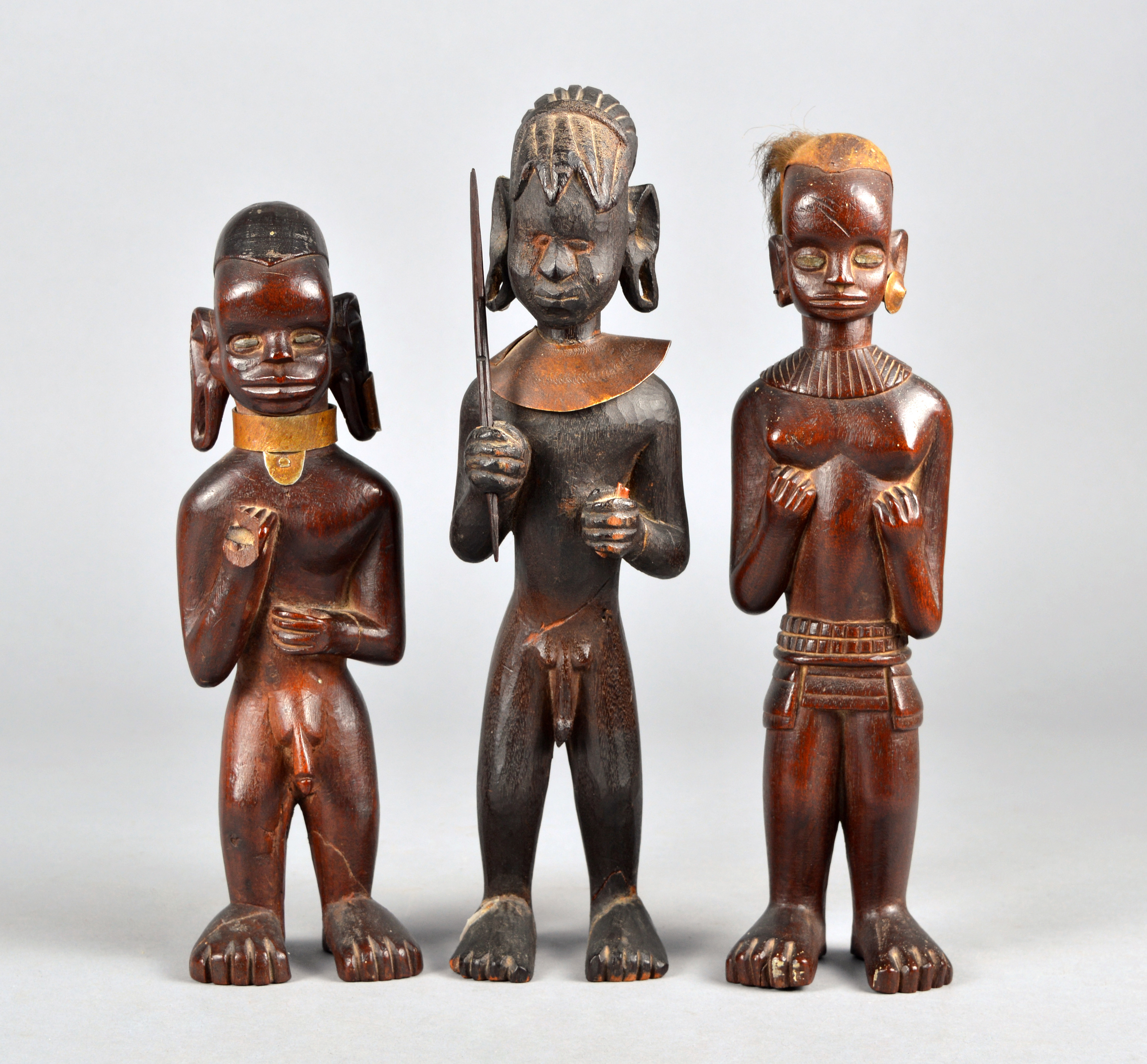 Three Kamba standing figures Kenya including two warriors with metal mounts