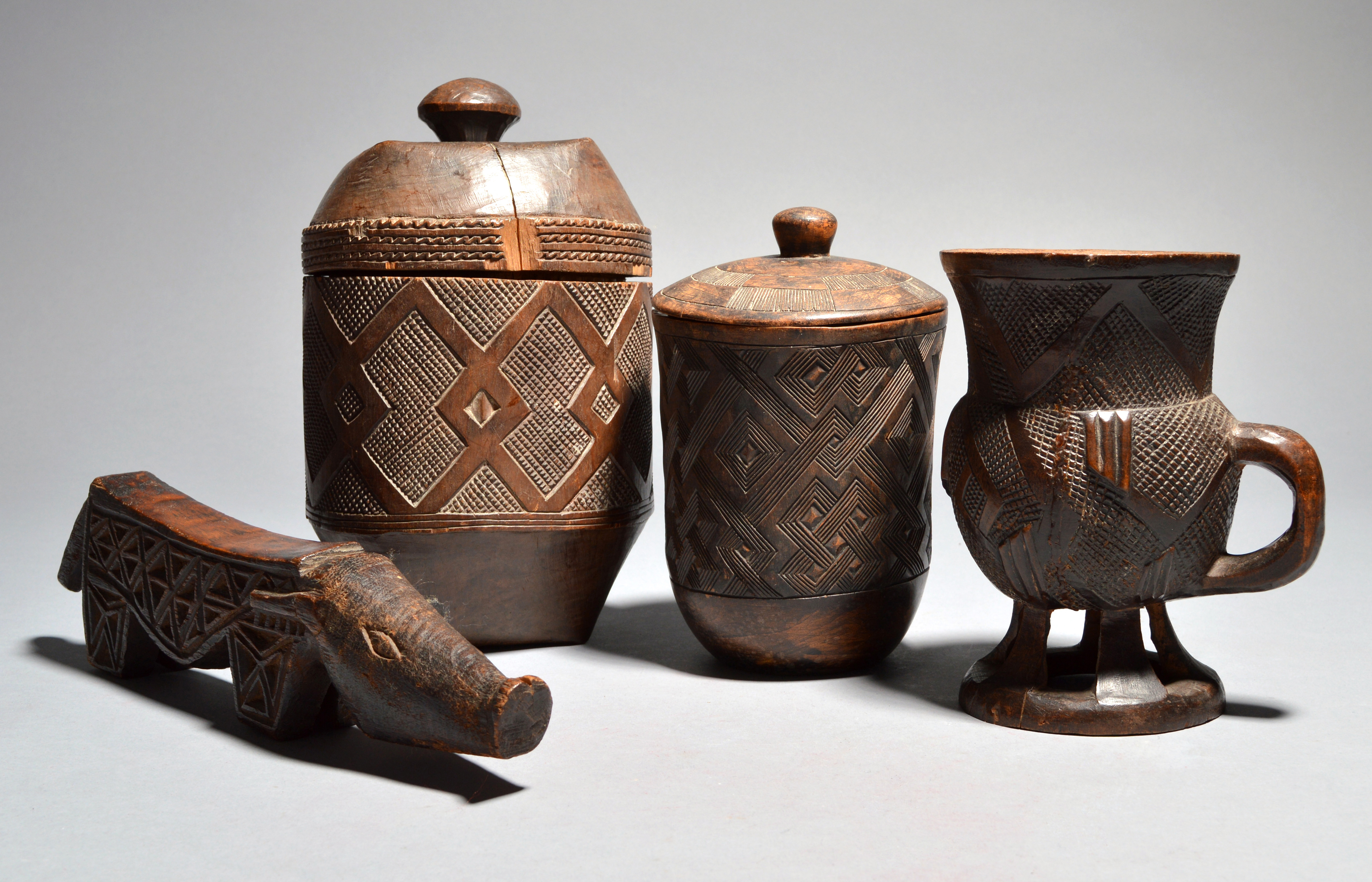 two Kuba cylindrical vessels with covers and a Kuba oracle, carved as a pig. (6)
