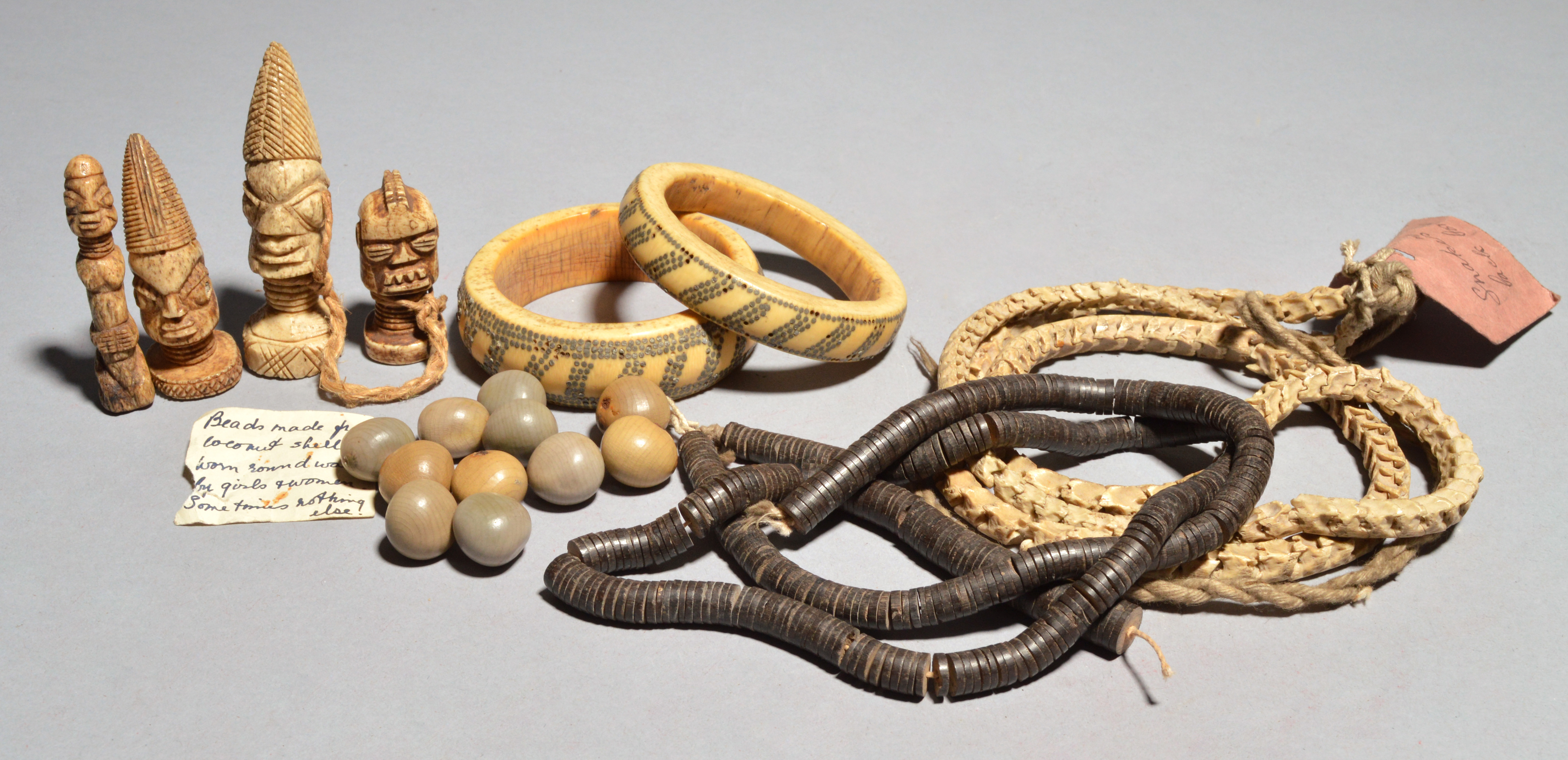 a bone figure amulet, two ivory bracelets with inlaid pewter dots, a snake vertebrae, a coconut slice strand and a quantity of coconut shell beads, with a handwritten note Beads made from coconut shell. Worn around waist by girls & women. Sometimes nothing else