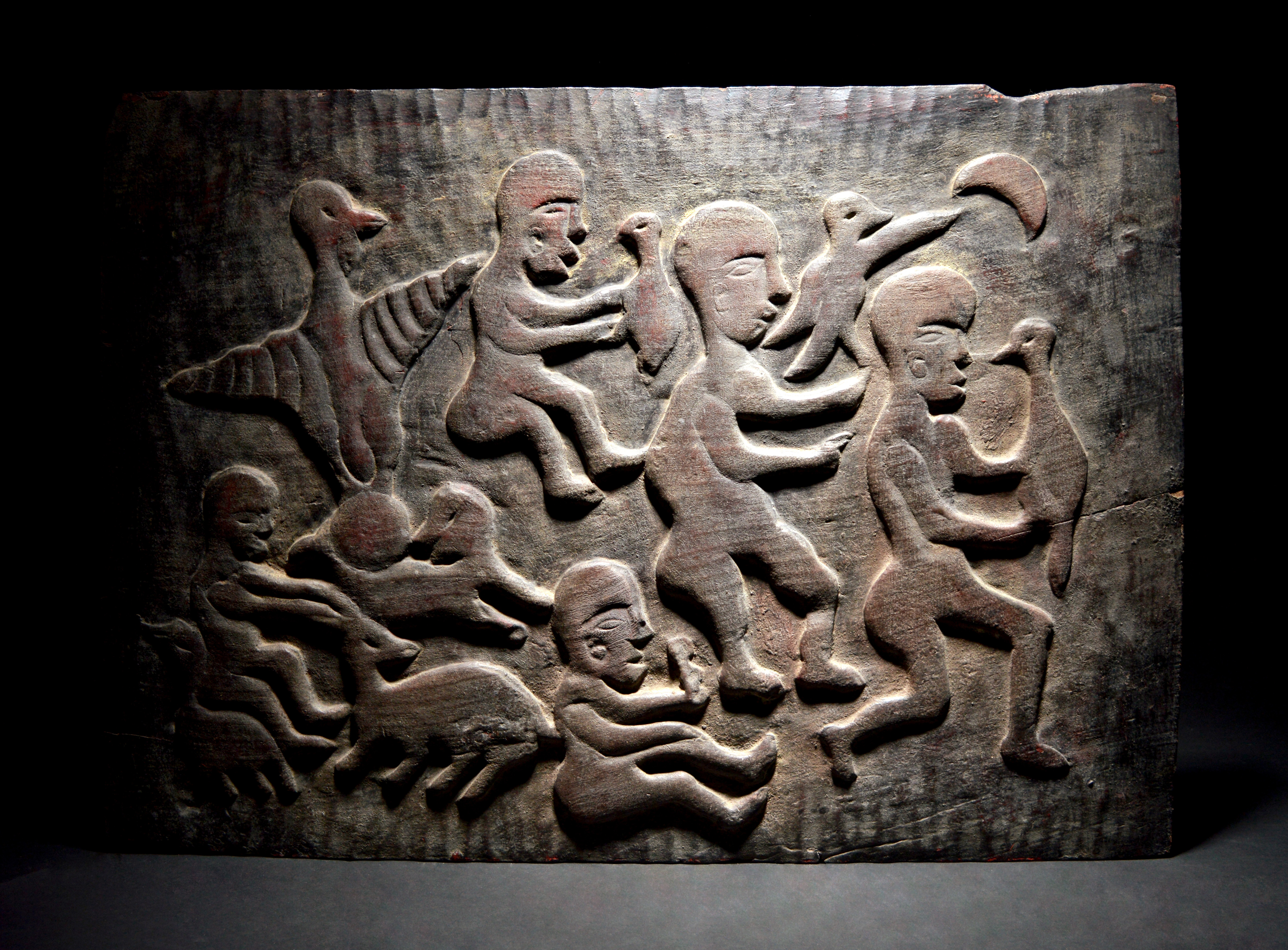 wood and red lacquer, depicting three figures holding birds, one with it's wing pointing at the moon, two seated figures and animals and a phoenix on a sphere,